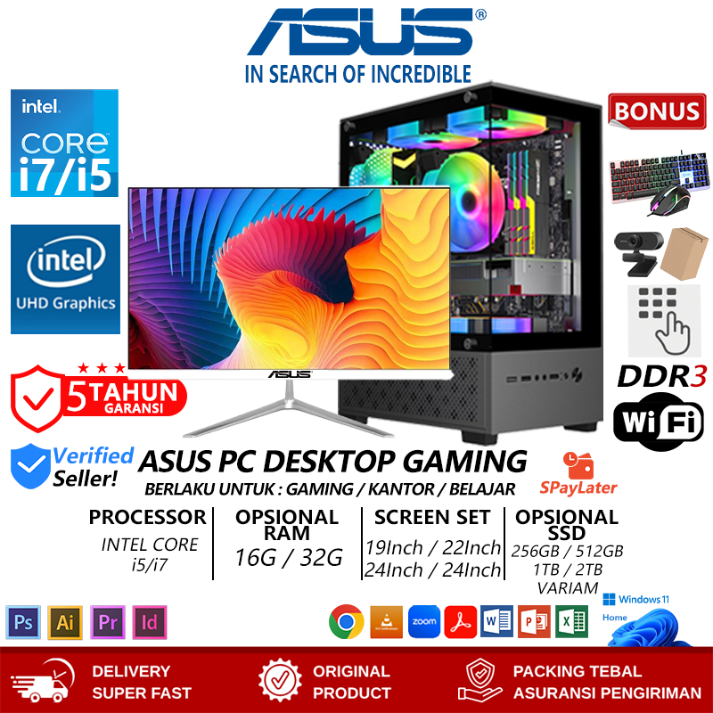 ASUS PC INTEL 12 CORE PC GAMING FULL SET DESKTOP KOMPUTER KANTOR, MESIN PERAKITAN DESAIN, MENDUKUNG WIFI/BLUETOOTH, 19/22/24/27 INCI LAYAR LENGKUNG UN