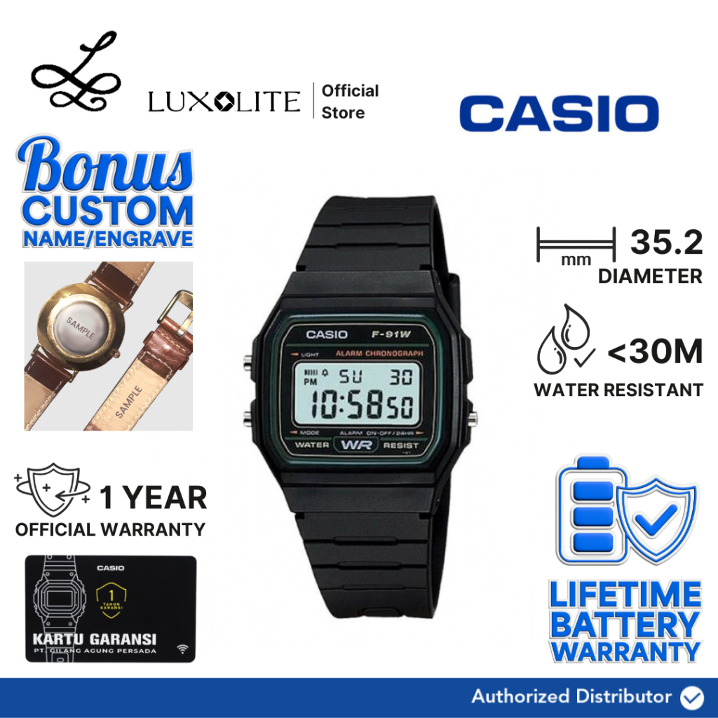 [Luxolite] CASIO Jam Tangan Unisex Digital F-91W-3DG/F-91W-3D/F-91W-3 Black Resin Strap