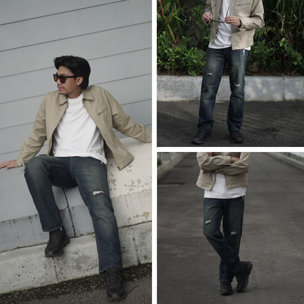Nowear Celana Jeans Panjang Sobek Pria Salvedge Wisker Slim Straight Ringkel Denim Premium
