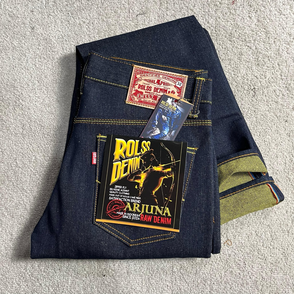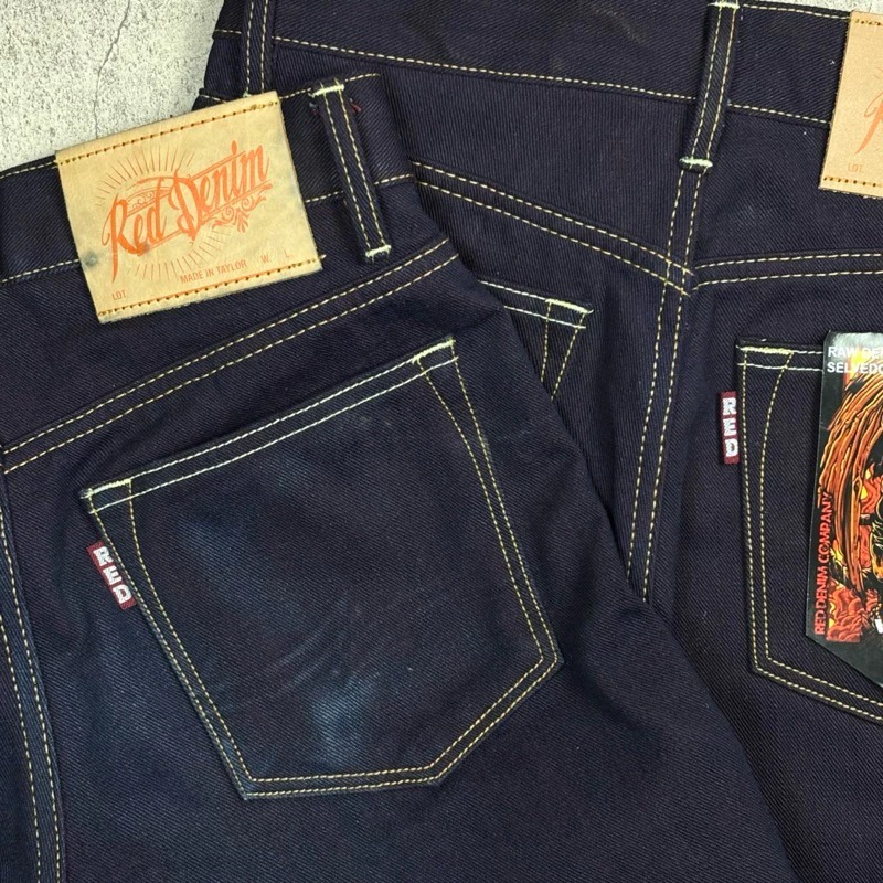 RED DENIM - denim selvedge accent weft merah slim straigh deep blue.