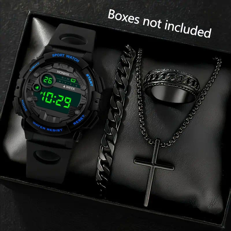 4pcs Jam Tangan Digital Olahraga Tahan Air Untuk Pria Dengan Tampilan Tanggal Dan Fungsi Lampu Malam Paket Hadiah Untuk Pria (Tanpa Kotak)