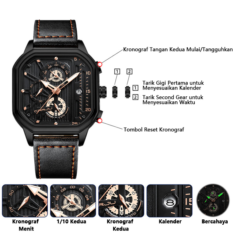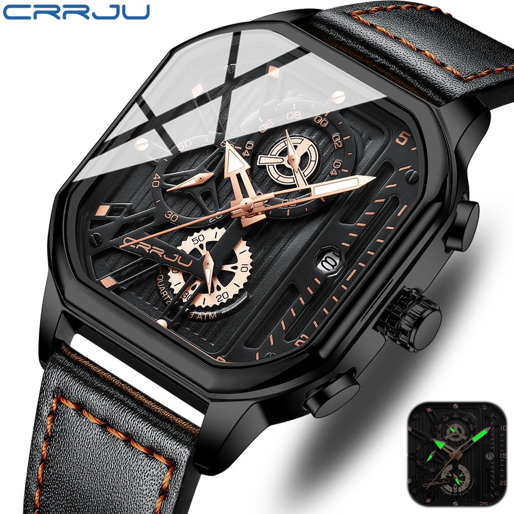 CRRJU Jam Tangan Pria Tren Fashion Asli Kreatif Panggil Persegi Kulit Kuarsa Tahan Air 2302