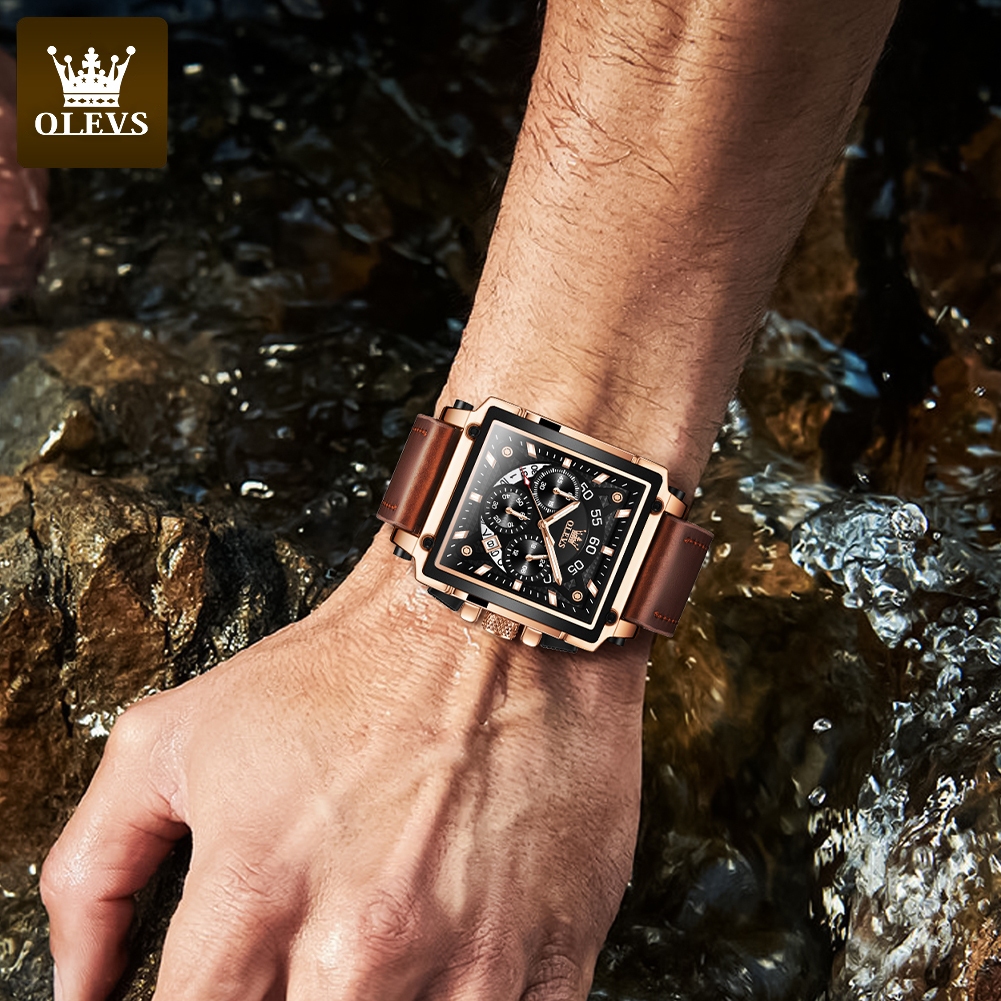 OLEVS Jam Tangan Pria Kulit Anti Air Original Asli Terbaru Casual Tahan Air Square Chronograph Leather Dengan Kotak Tanggal Hitam 9919
