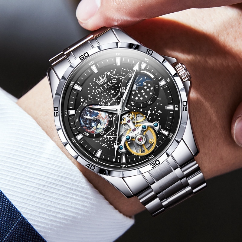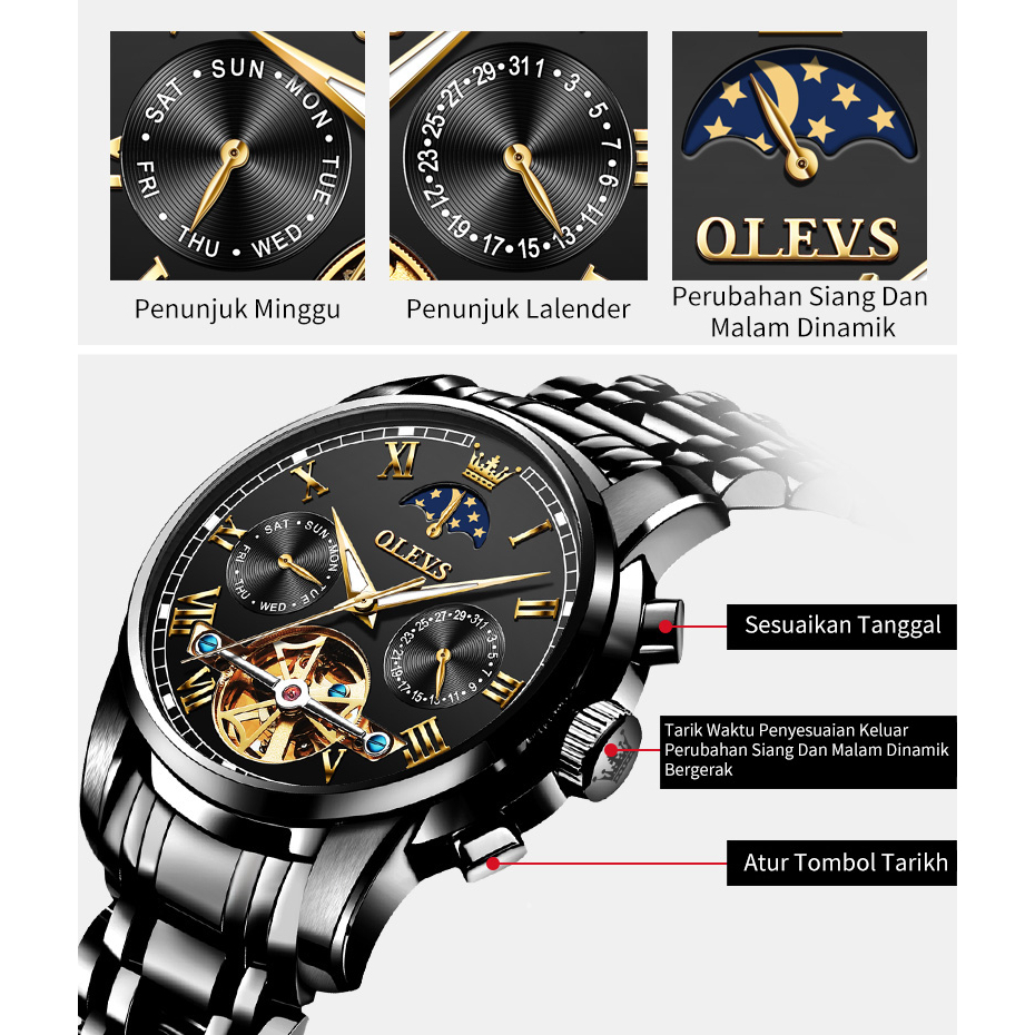 OLEVS Jam Tangan Automatic Pria Anti Air Original Tahan Keren Led Terbaru Luxury Chronograph Stainless Watch Men Biru Hitam Putih Kotak Indah Gratis