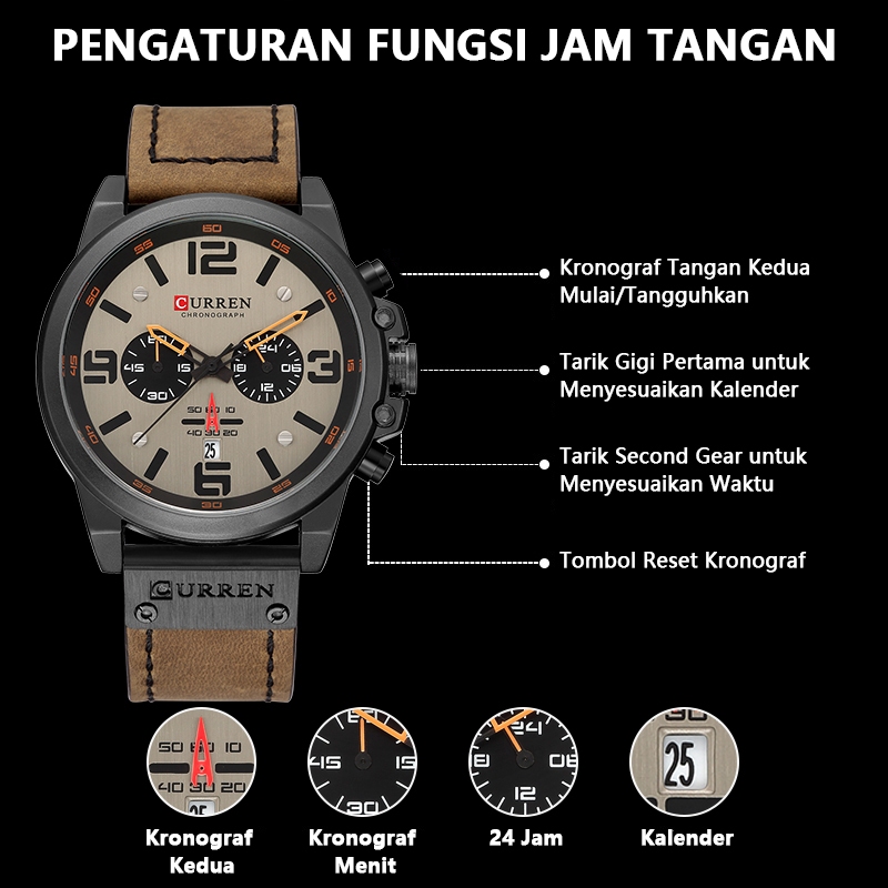 CURREN Jam Tangan Pria Kalender Kuarsa Santai Bisnis Tali Kulit Crononya Aktif Jam Tangan Cowok