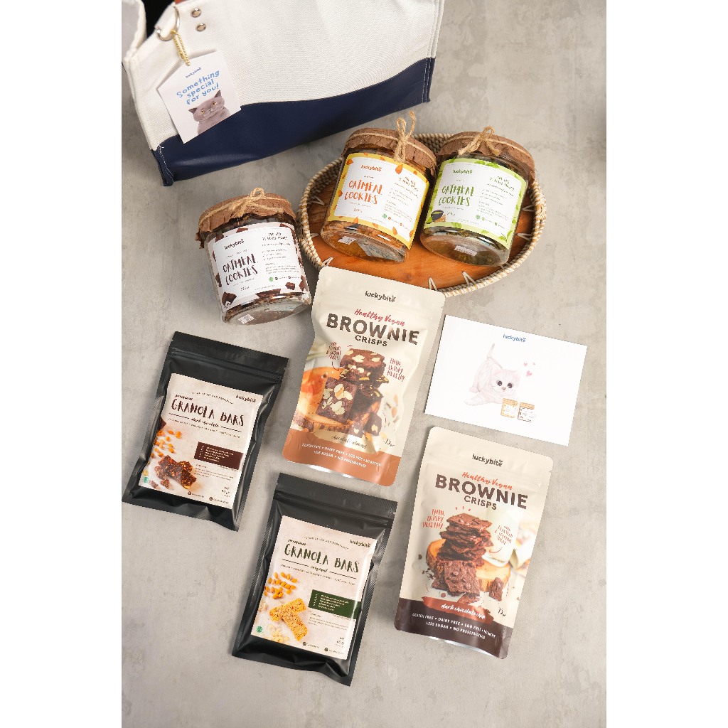 HAMPERS / PARCEL / KADO - PREMIUM CANVAS BAG / TAS CANVAS - OATMEAL COOKIES + BROWNIE CRISPS + GRANOLA BAR + FREE GREETING CARD + BOX + BUBBLE WRAP | LUCKYBITE