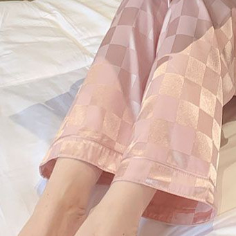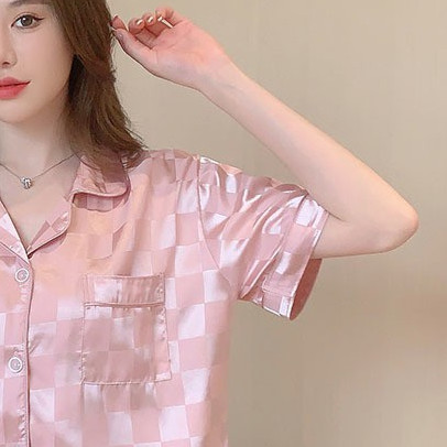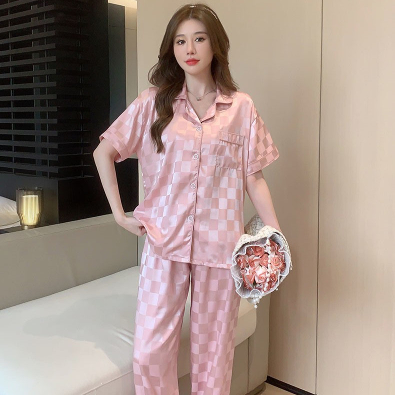 MYRESELLER STELAN BAJU TIDUR IMPORT ICE SILK WANITA DEWASA MUSIM DINGIN SHORT SLEEVE KANCING KERAH MOTIF KOTAK KOTAK ELEGANT CELANA PANJANG SATIN BEST QUALITY CPLUX