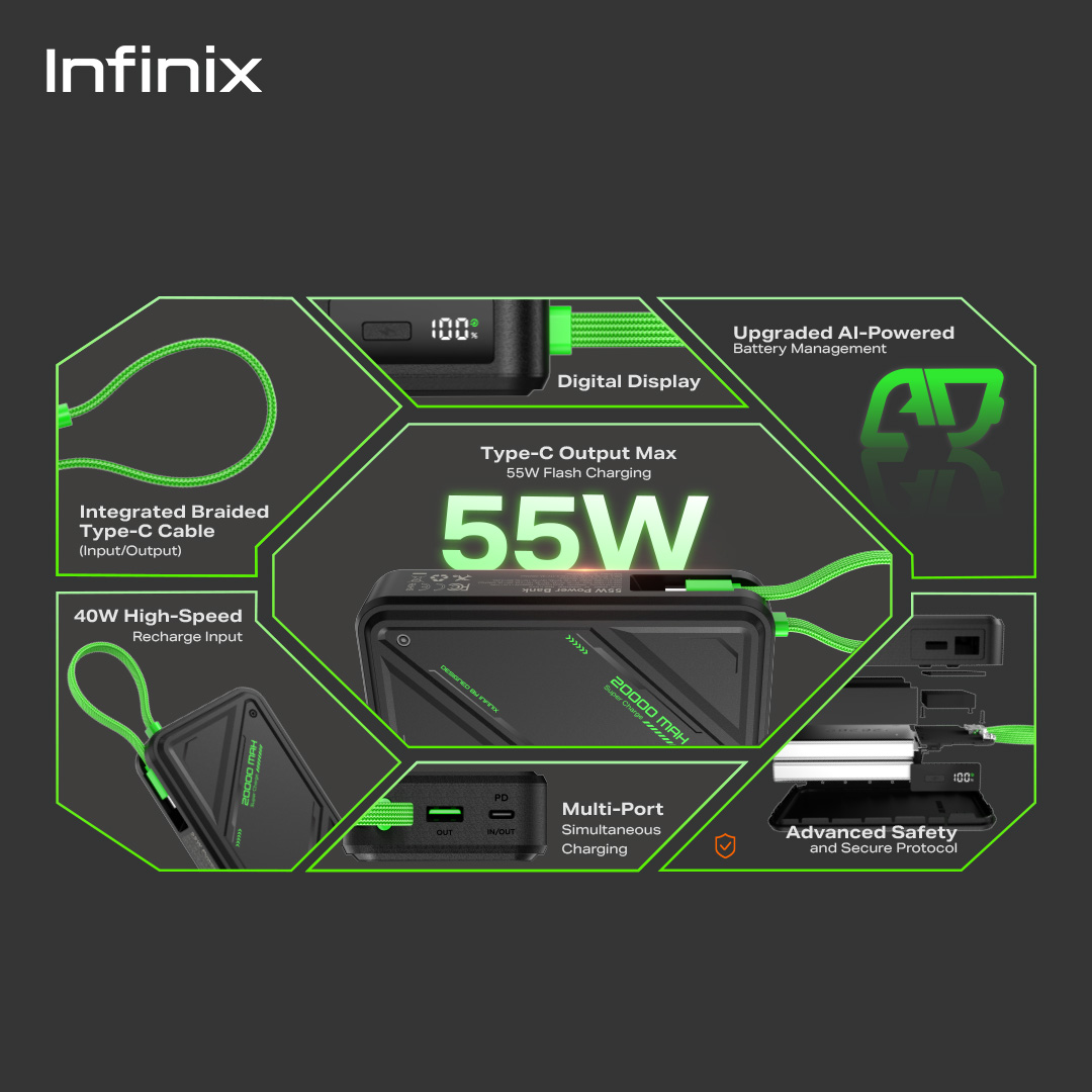 [Mall] Infinix GTPower XP20 GT Powerbank 20000mAh, 55W Max Charging, AI-Powered Battery Management + Type-C✨