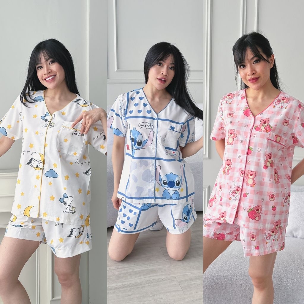 PIYAMA CELANA PENDEK SET KATUN | TANPA KERAH (VNECK) - PIYAMA WANITA KANCING BUSUI FRIENDLY