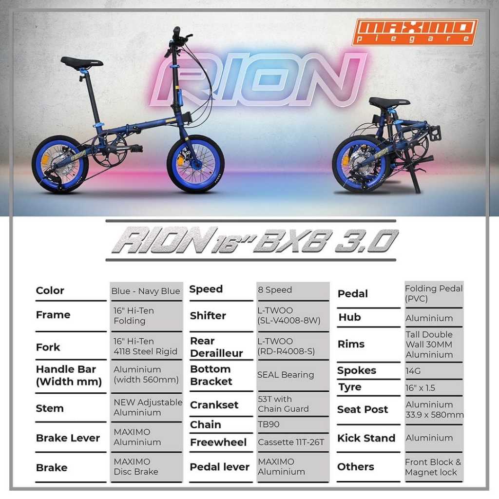 RION MAXIMO PIEGARE 16 INCH SEPEDA LIPAT BX8 3.0 / TX7 3.0 / EX9 8.0 / OIX10 8.0 / TROY 10SP