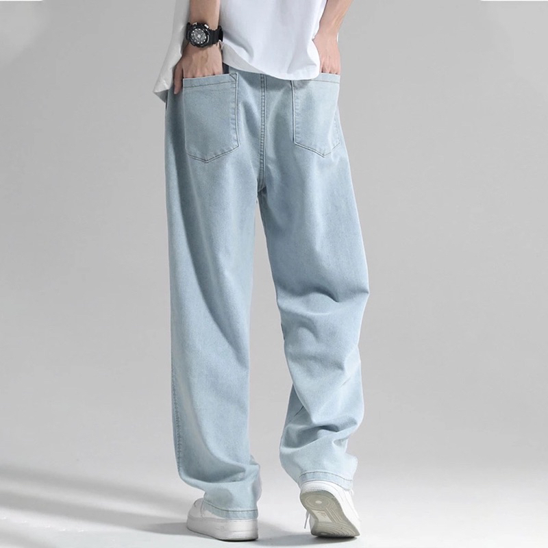 Celana Jeans Pria Pinggang Karet Korean Style Loose Pants Kulot Jeans Biru Muda Oversize Jumbo Tali Serut