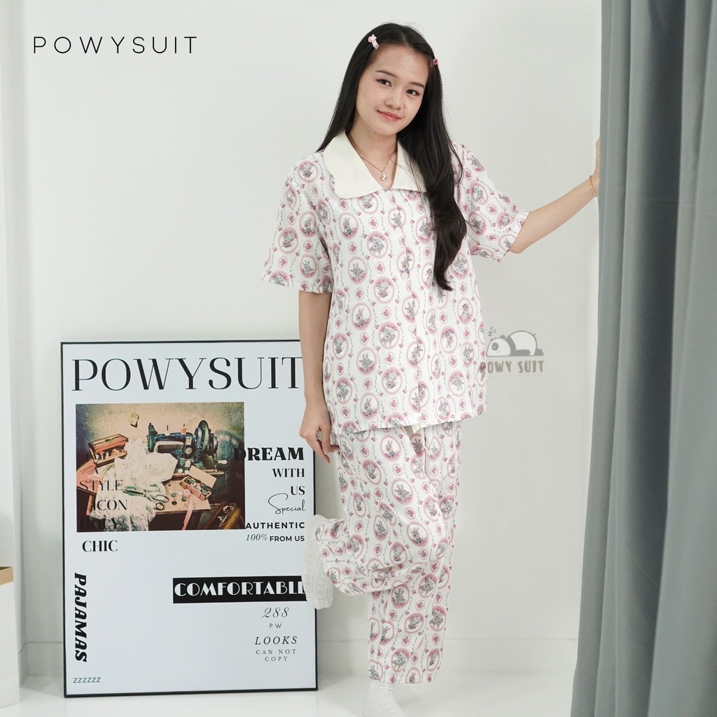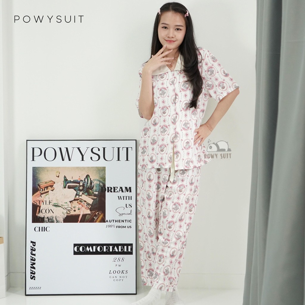 ST RABBIT PIYAMA POWYSUIT SATIN SUTRA BAJU TIDUR WANITA LENGAN PENDEK CELANA PANJANG LEMBUT SETELAN