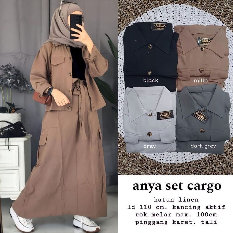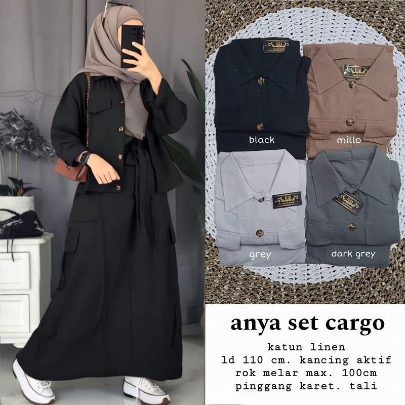 Setelan 2 In 1 Anya Cargo Set Bahan Katun Linen Ootd Muslim Wanita Simple Atasan + Rok Kekiniqan