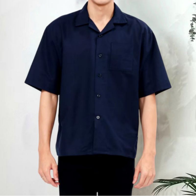 Cuban Bowling Boxy Oversized Linen Shirt Kemeja Linen Bowling Polos Pria Kerah Terbuka Lengan Pendek