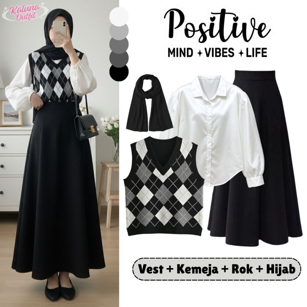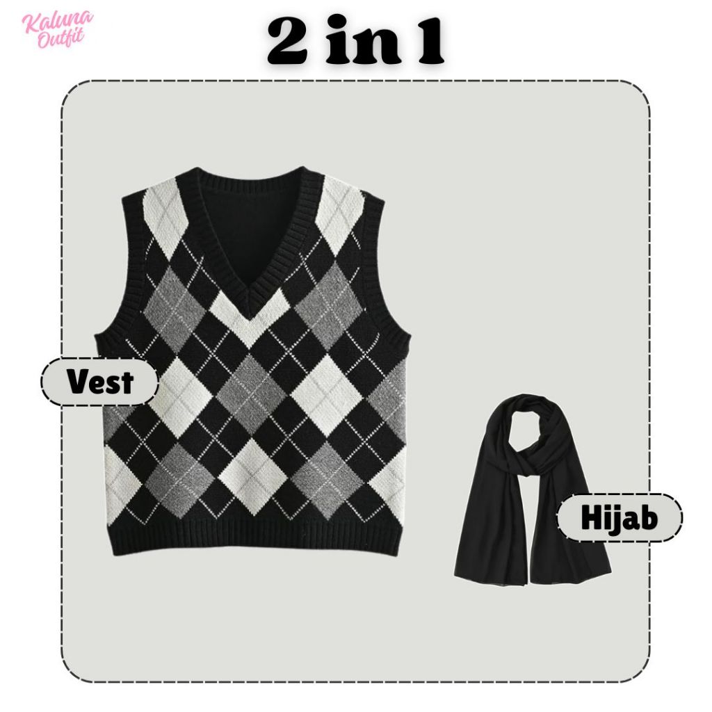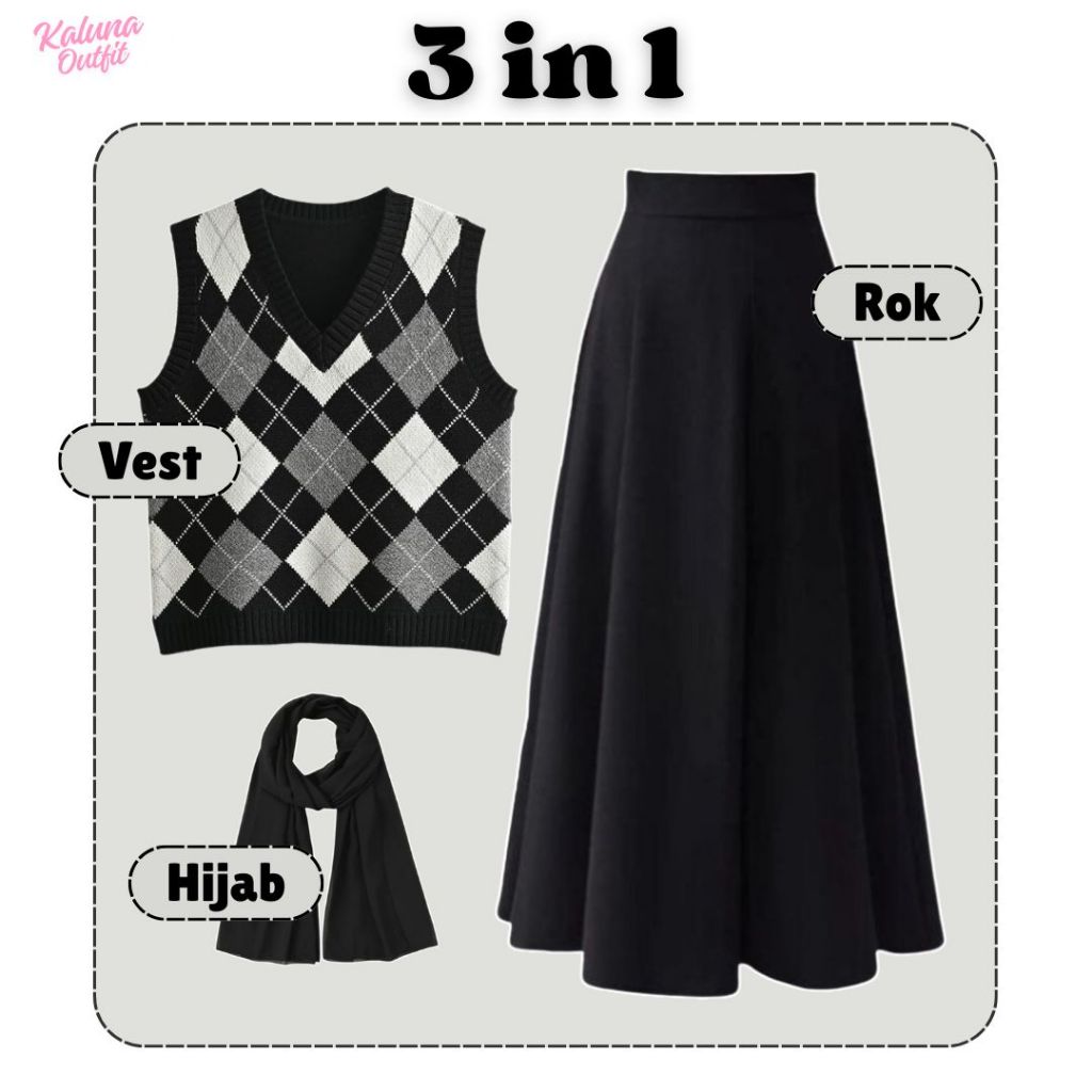 One Set Wanita Vest Diamond Rajut Kemeja Crop Puff Katun Rok Joda Hyget Pashmina Ceruty Outfit Lebaran Bukber Remaja Kekinian Setelan Cewe Campus Kece Hangout Ala Korean Style Viral Ko5F