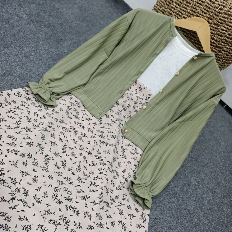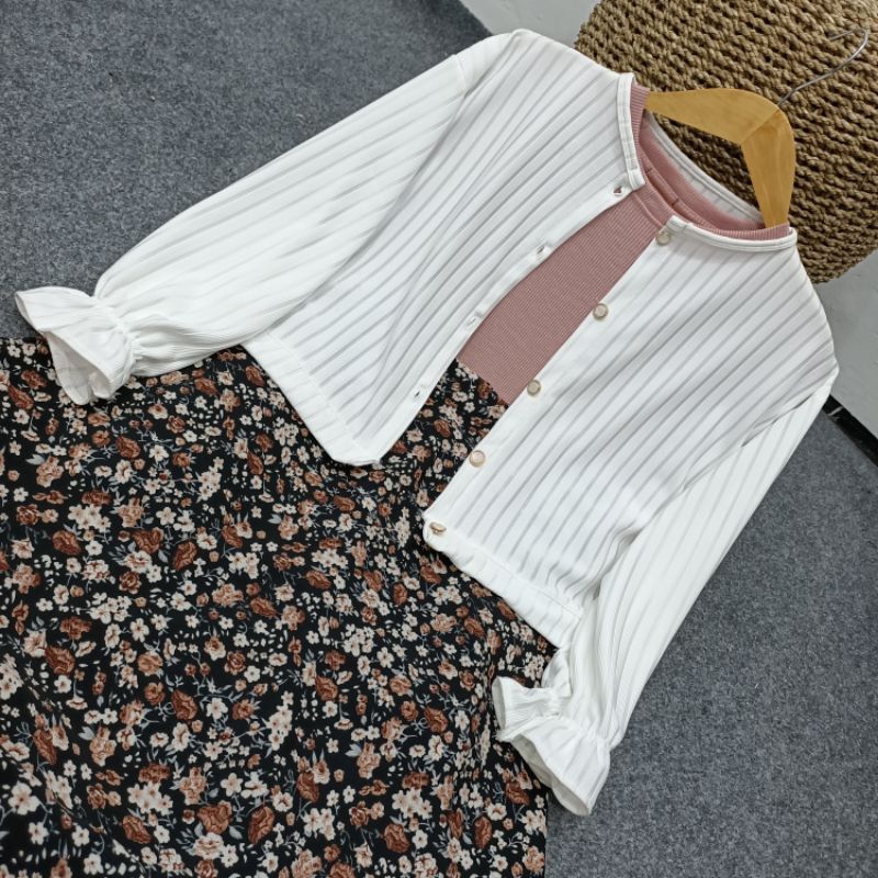 Setelan Oneset Cardi Button + Inner + Rok Floral Skirt Setealan 3In1 Paket Hemat Kekinian
