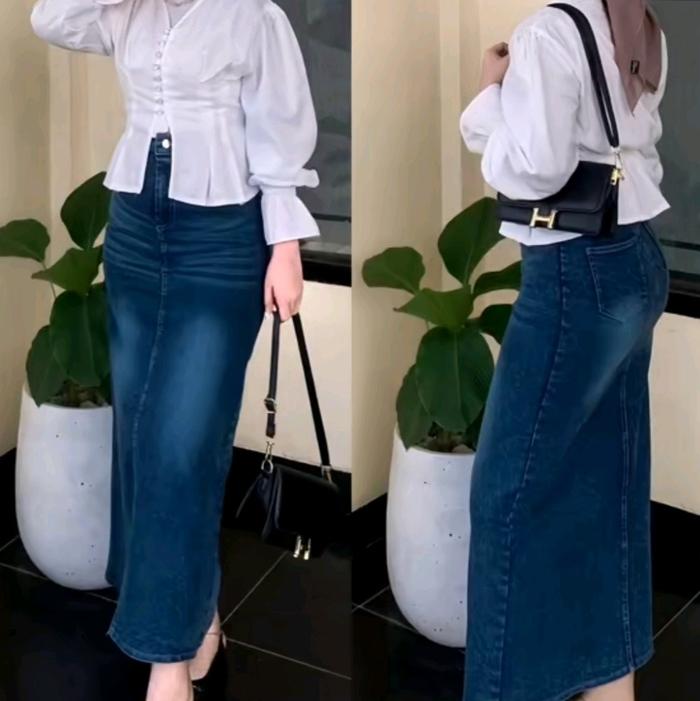 PG JEANS - ROK CESSA JEANS TREND SLIM-FITTING KOREAN STYLE BELAH DEPAN PANJANG WANITA KANCING KARET TEBAL DENIM - GREEN, SUPER JUMBO
