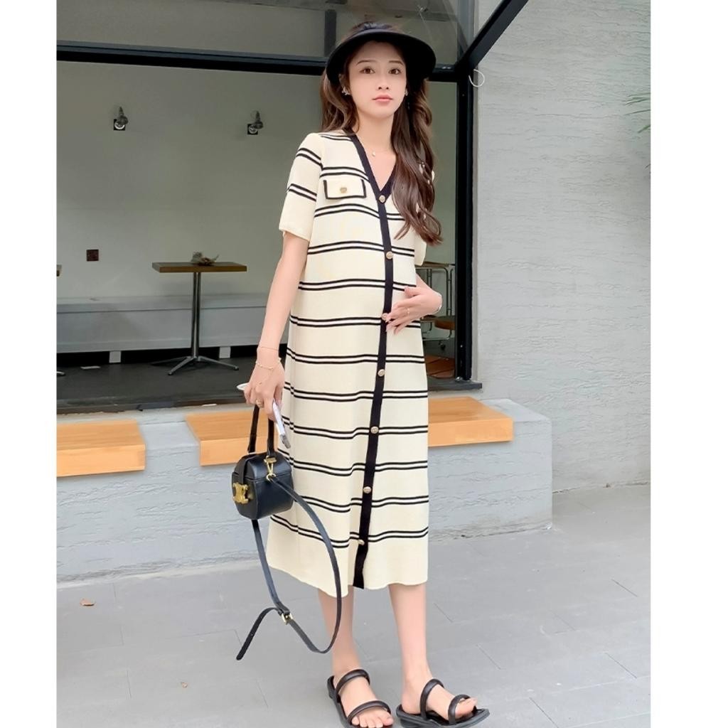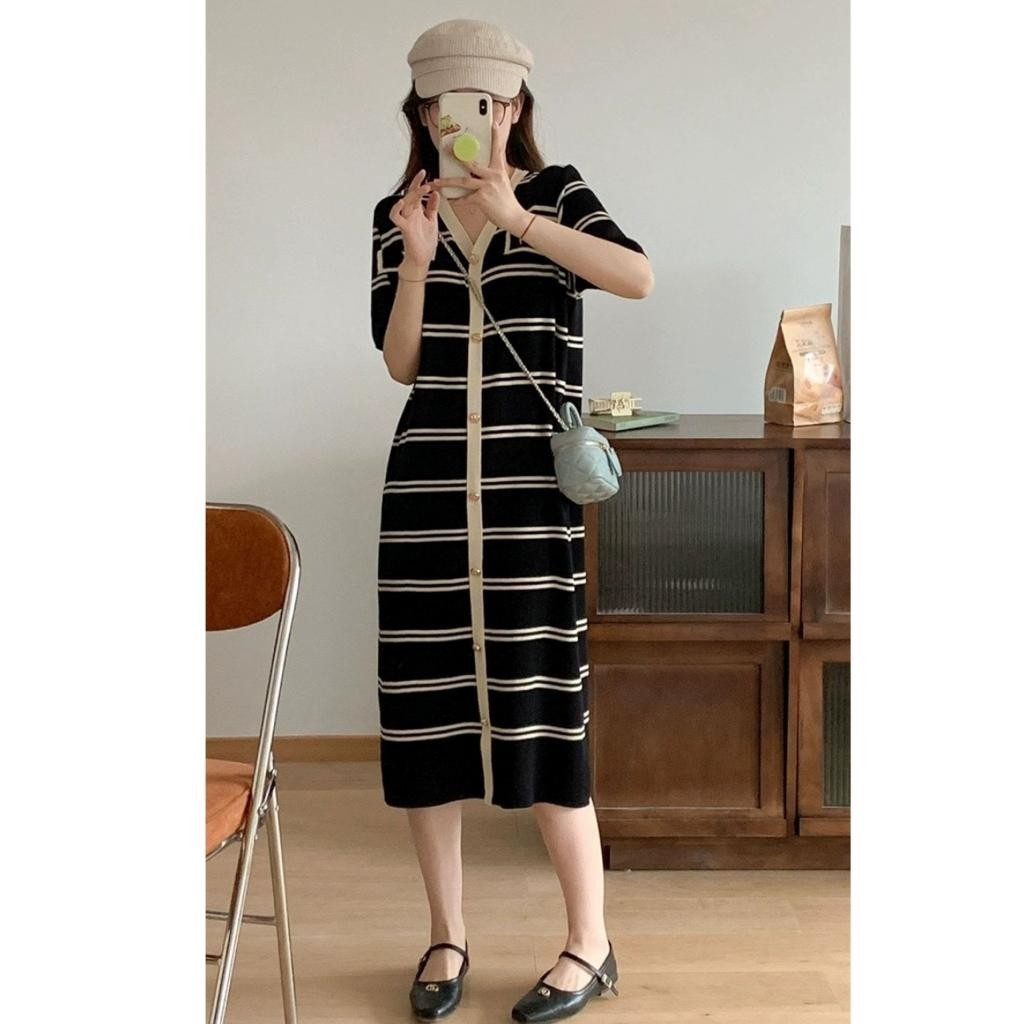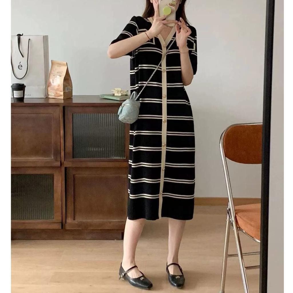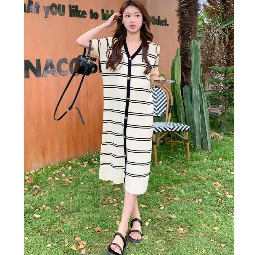 Amber Dress Rajut Elegan Wanita Model Korea Salur Kekinian Lengan Pendek Kancing Depan