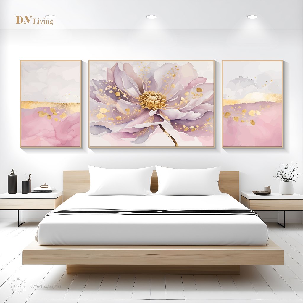 DVLIVING Hiasan Dinding Ruang Tamu Minimalis 80x57cm & 40x57cm Floral Gold Pink INCLUDE FRAME - Wall Decor Bunga Emas Pink Putih Biru Fancy