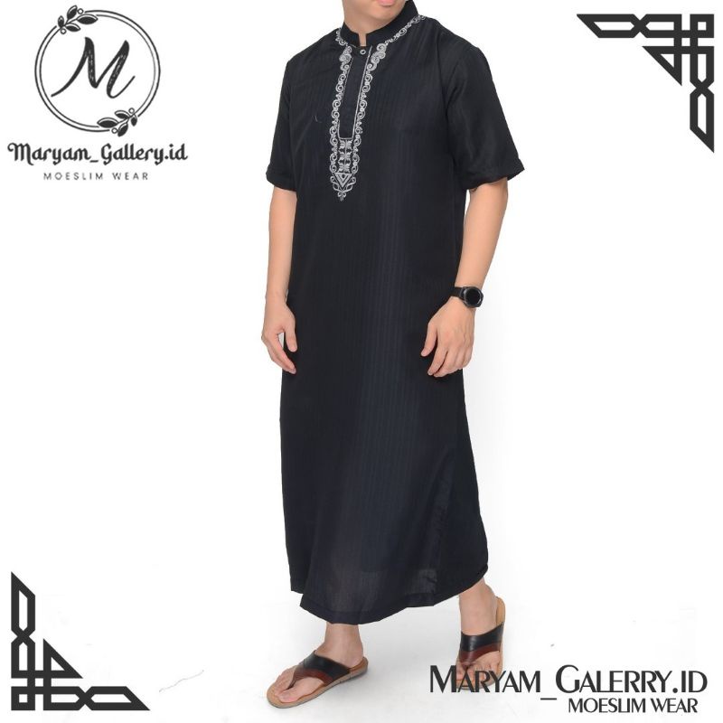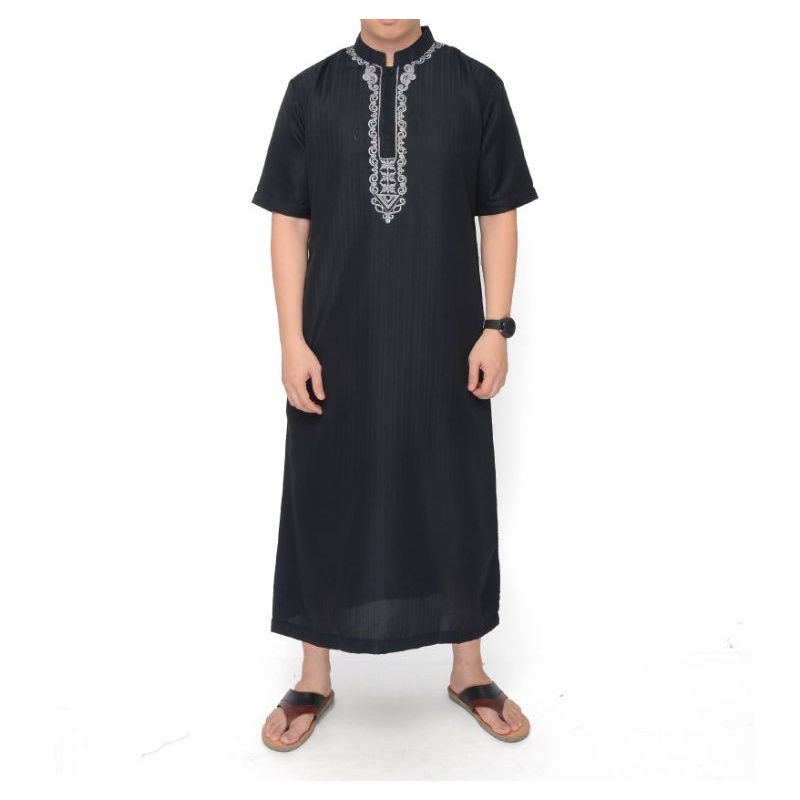 Gamis/Jubah Pria Hitam Lengan Pendek Bordir Dada Benang Putih