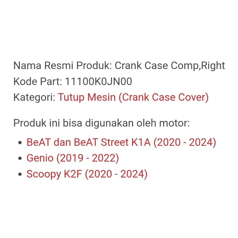 11100K0JN00 Blok Mesin Kanan Crankcase Comp R Bak Oli - BeAT Deluxe & BeAT Street Led K1A V1 , Scoopy eSP K2F , Genio K0