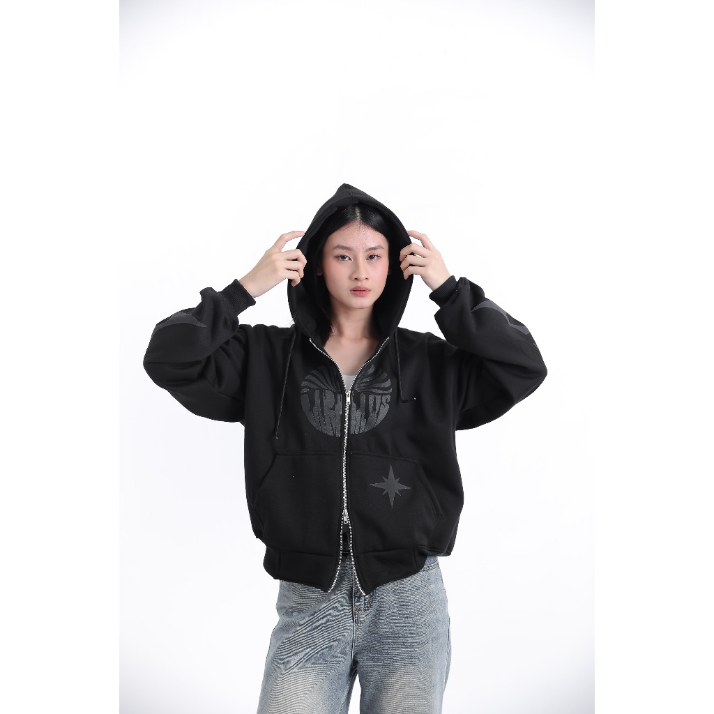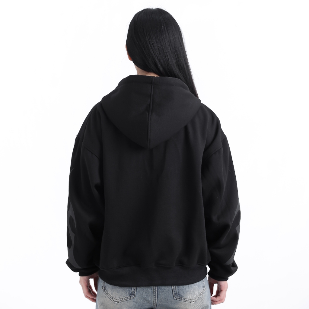 BARHAWS - Sweater Hoodie Boxy Double Zipper Oversize Sablon Puff Timbul Motif Lengan FullPrint Black