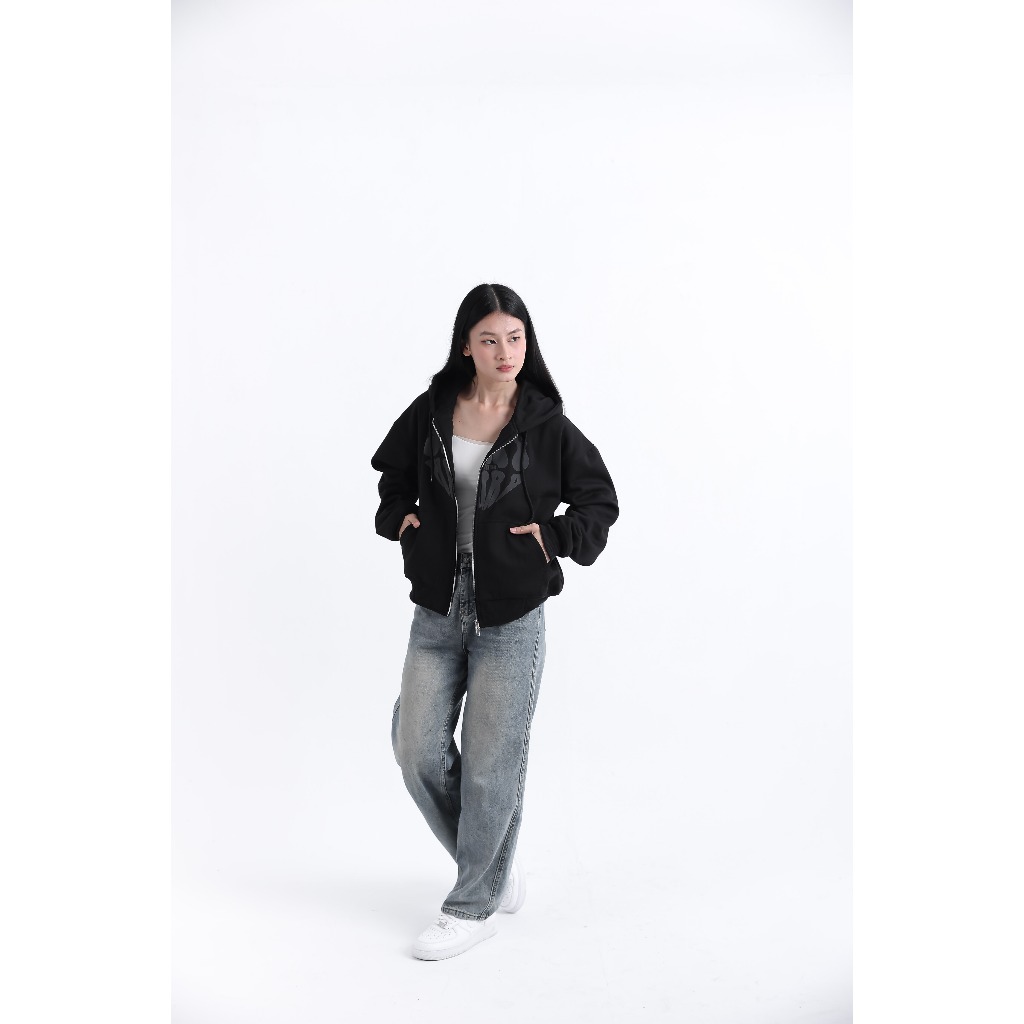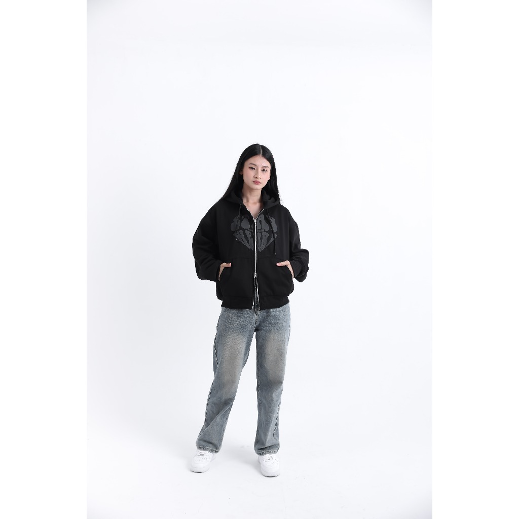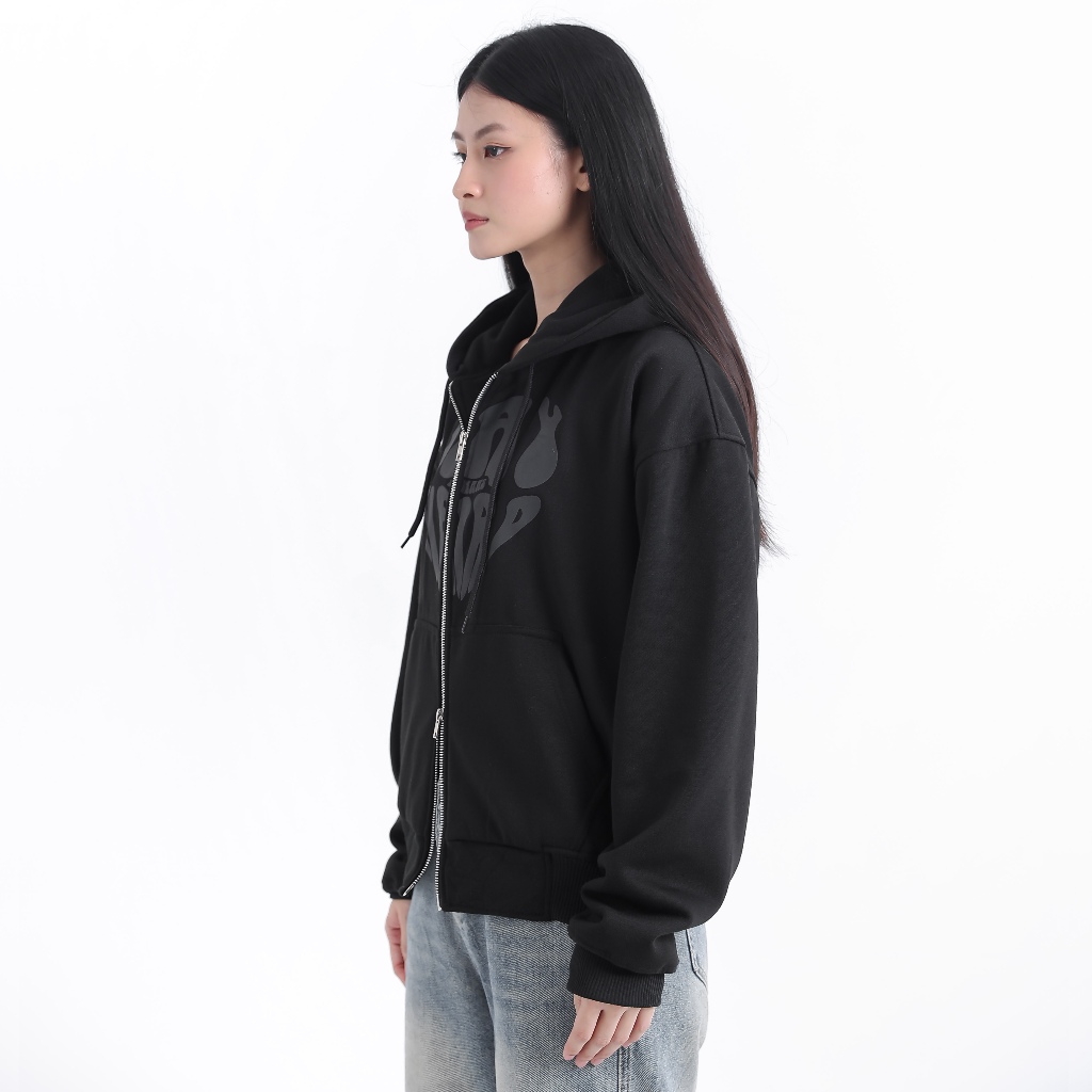 BARHAWS - Sweater Hoodie Boxy Double Zipper Oversize Pria Wanita Sablon Puff Timbul Stay Heart Black