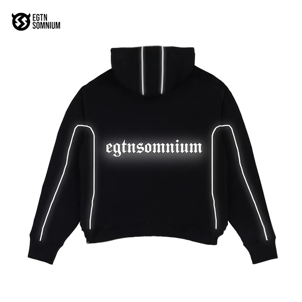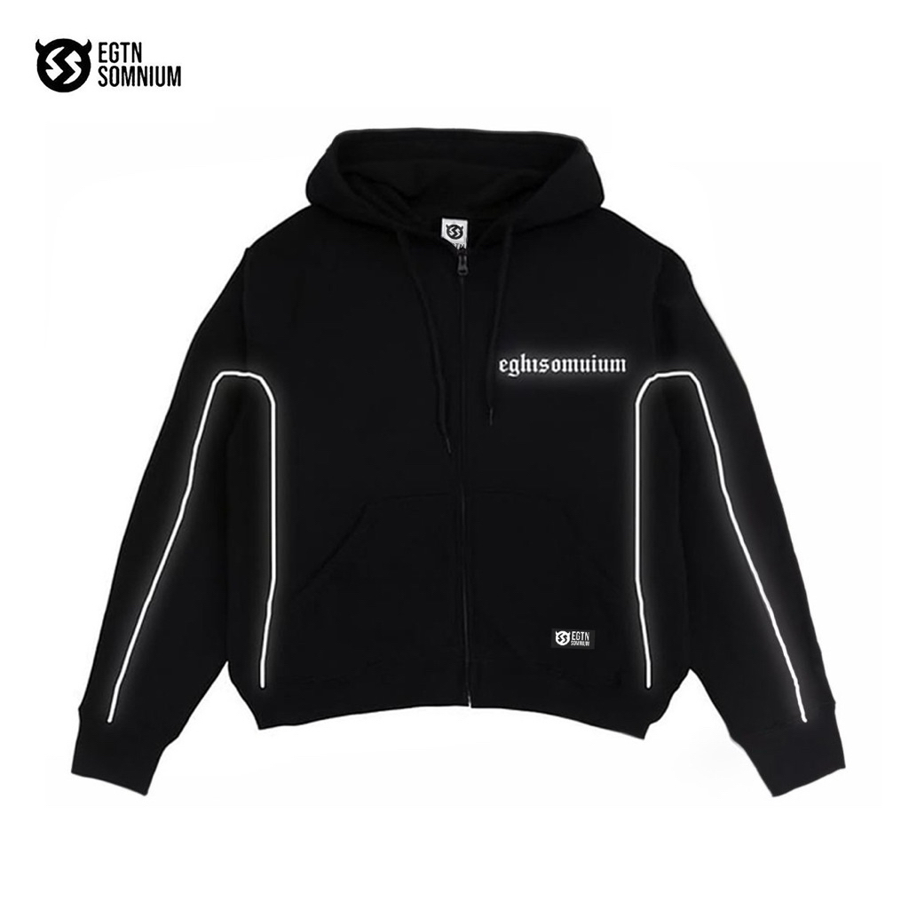 EGTNSOMNIUM Hoodie Zipper Boxy Reflective POWER Hitam Bahan Katun Fleece Gramasi 280 Desain Boxy Reflektif untuk Pria da