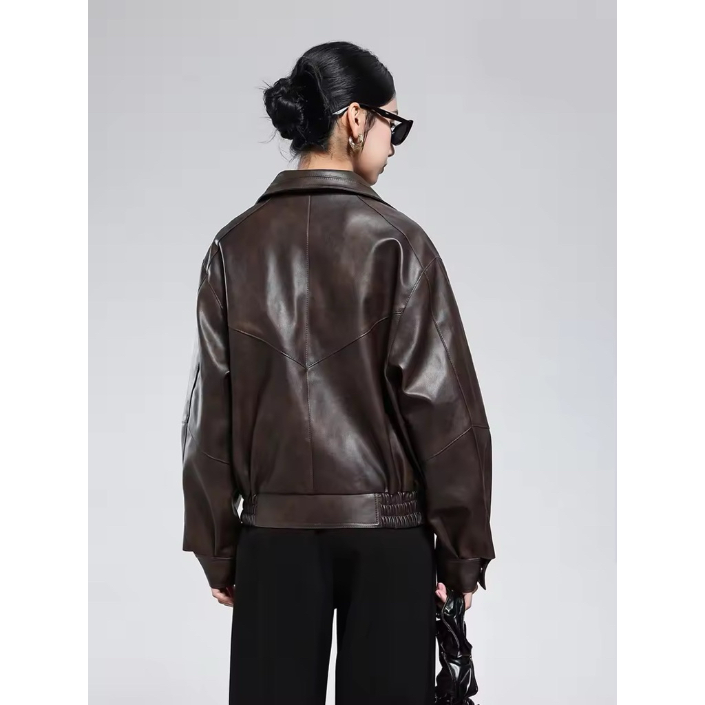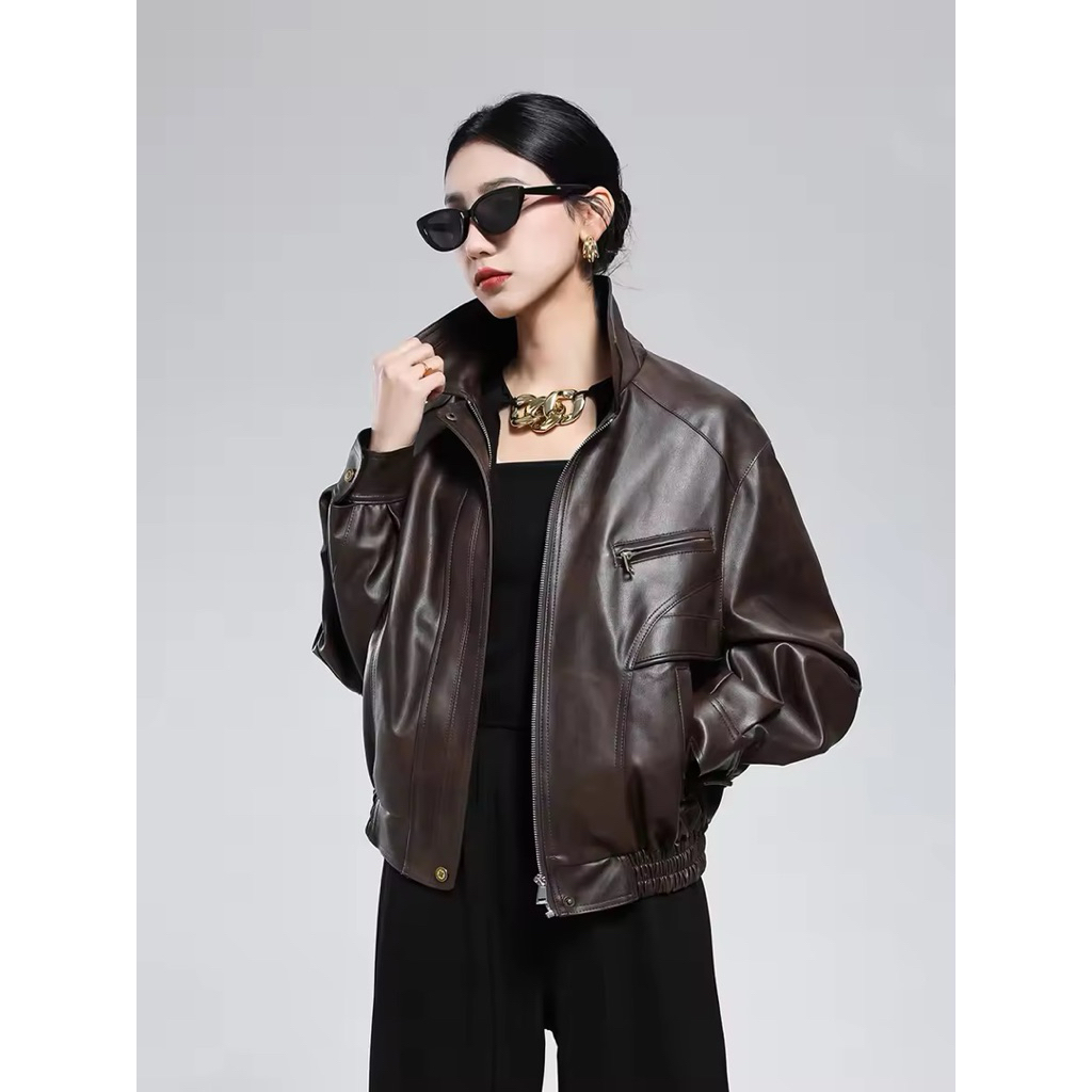 Hanifoleather.Id-Jaket Kulit Pu Wanita Musim Semi Musim Gugur Lautaro Warna Cokelat Wanita Kerah Turn-Down Ritsleting Me