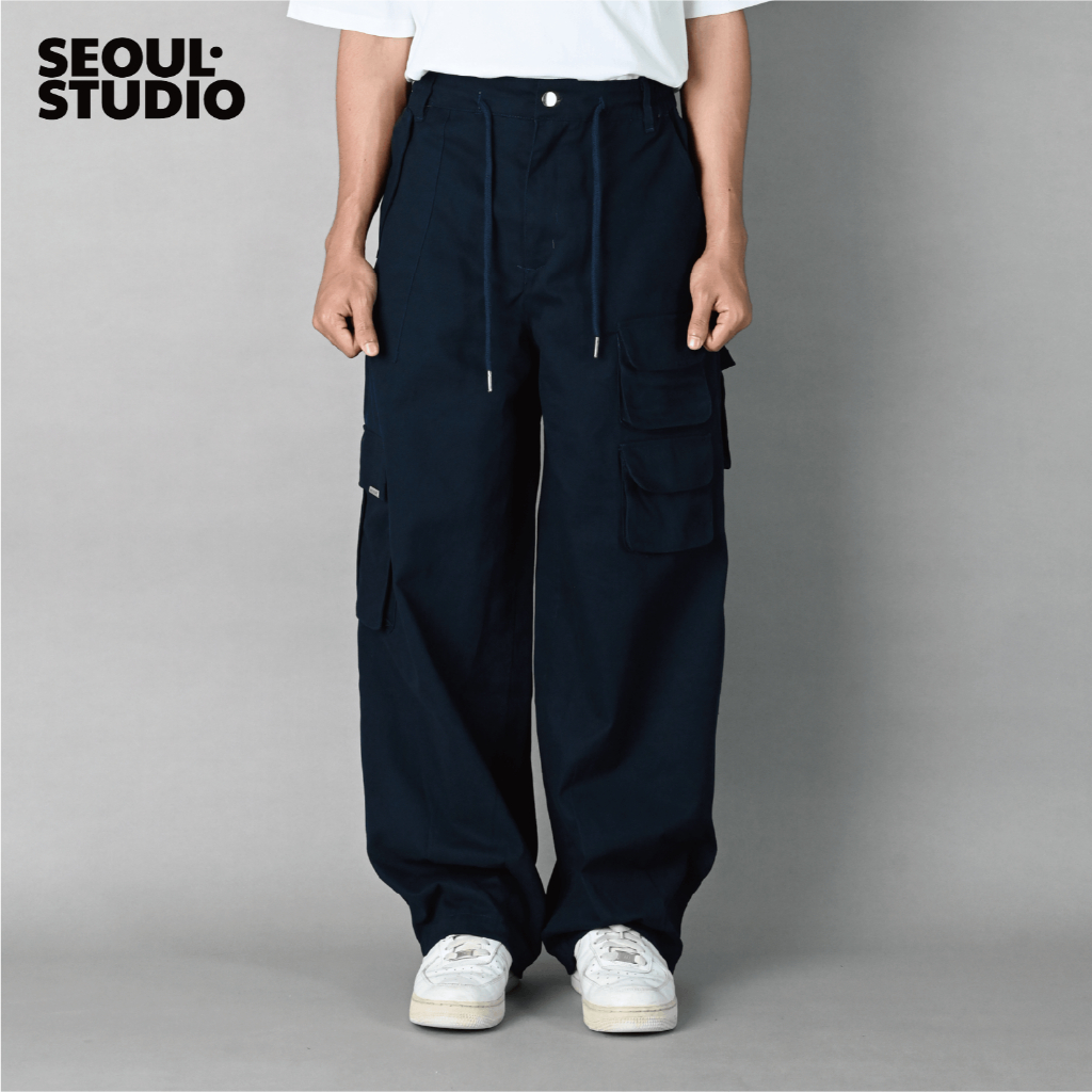Busan Navy Cargo Pants Wide Baggy Loose Fit Celana Cotton Twill Pria Jeans