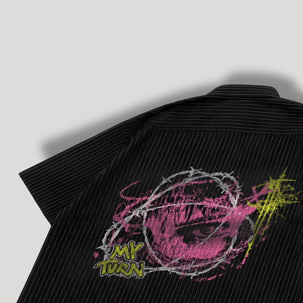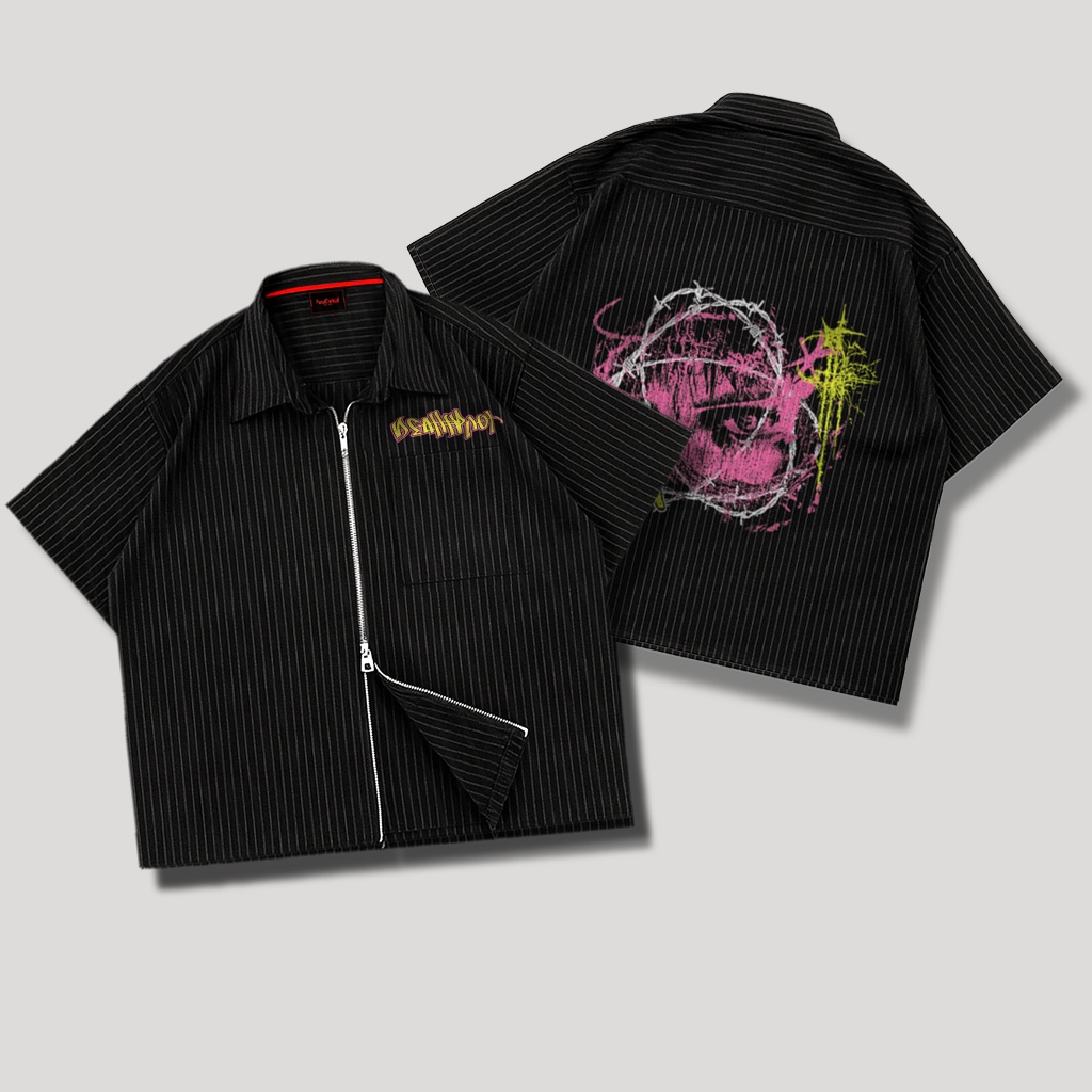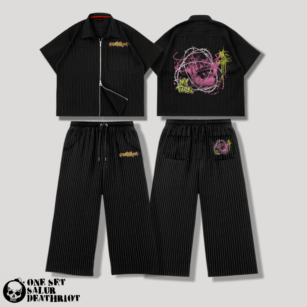 DTRT - One Set Workshirt Boxy Double Zipper Baggy Pants Stripe Salur Garis-garis hitam - Free Gift