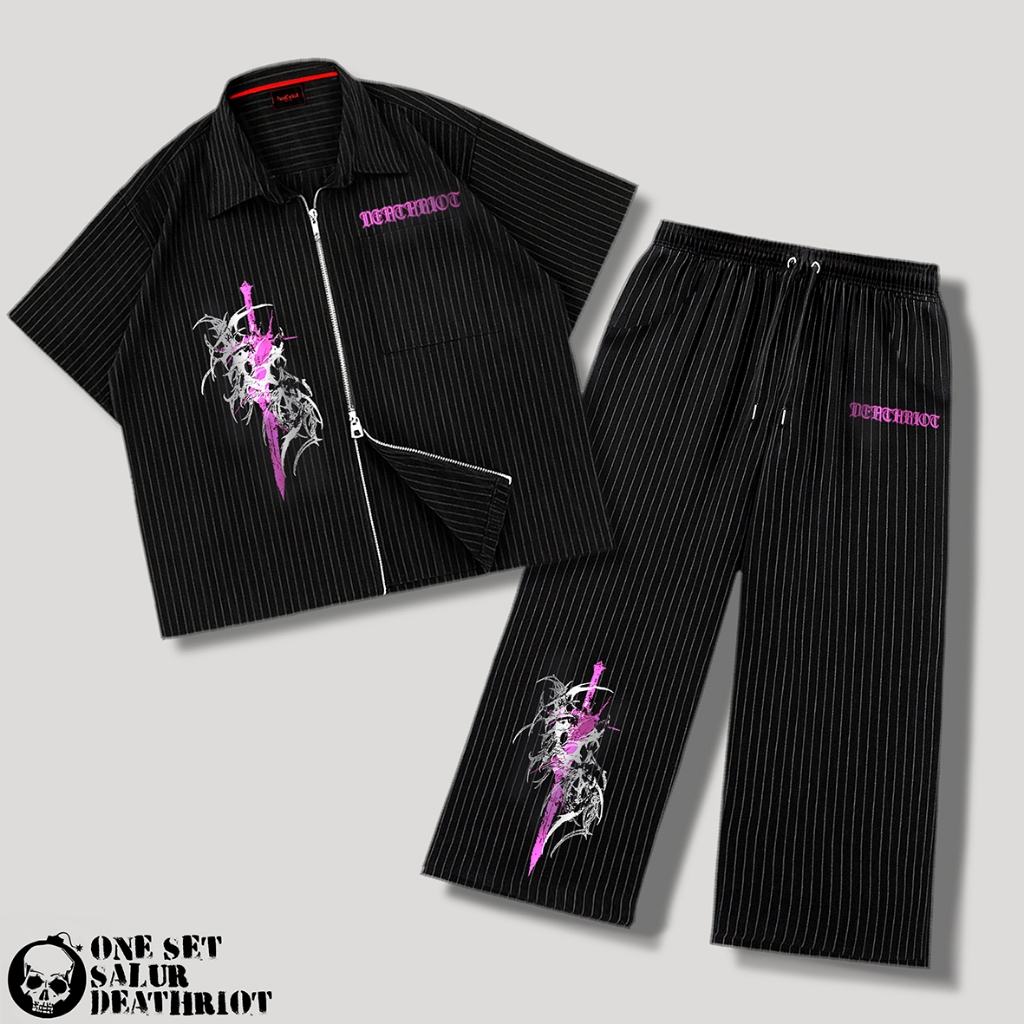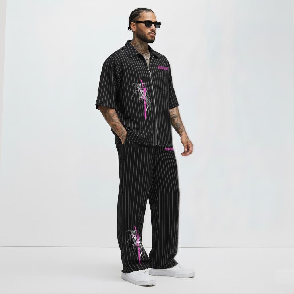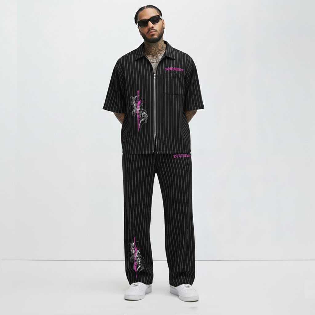 DTRT - One Set Workshirt Boxy Double Zipper Baggy Pants Stripe Salur Garis-garis hitam - Free Gift
