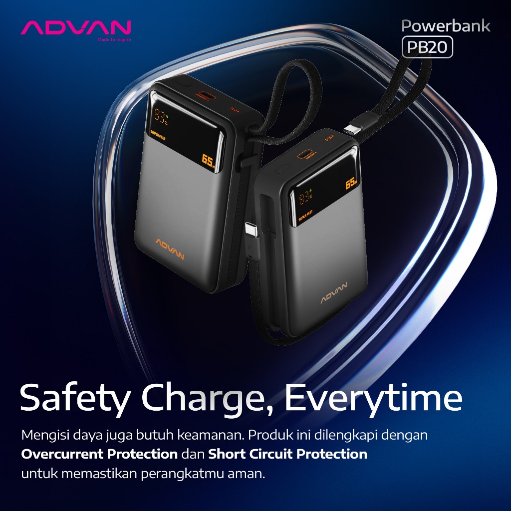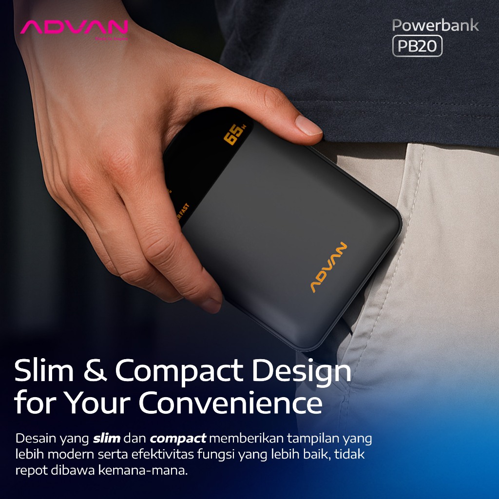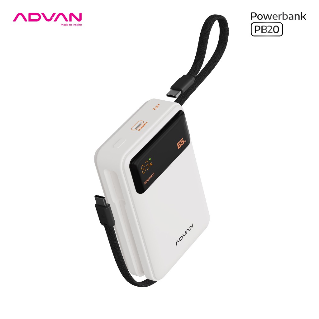 Advan Powerbank Pb20 | 20.000Mah | 65W Super Fast Charging | Built-In Type-C Cable | Dual Port | Slim & Compact Design |