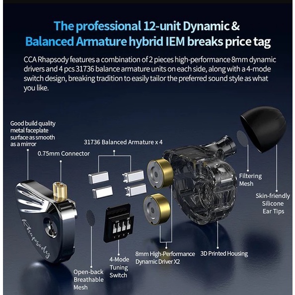 Cca Rhapsody 2Dd + 4Ba Hybrid Iem Hifi Earphone