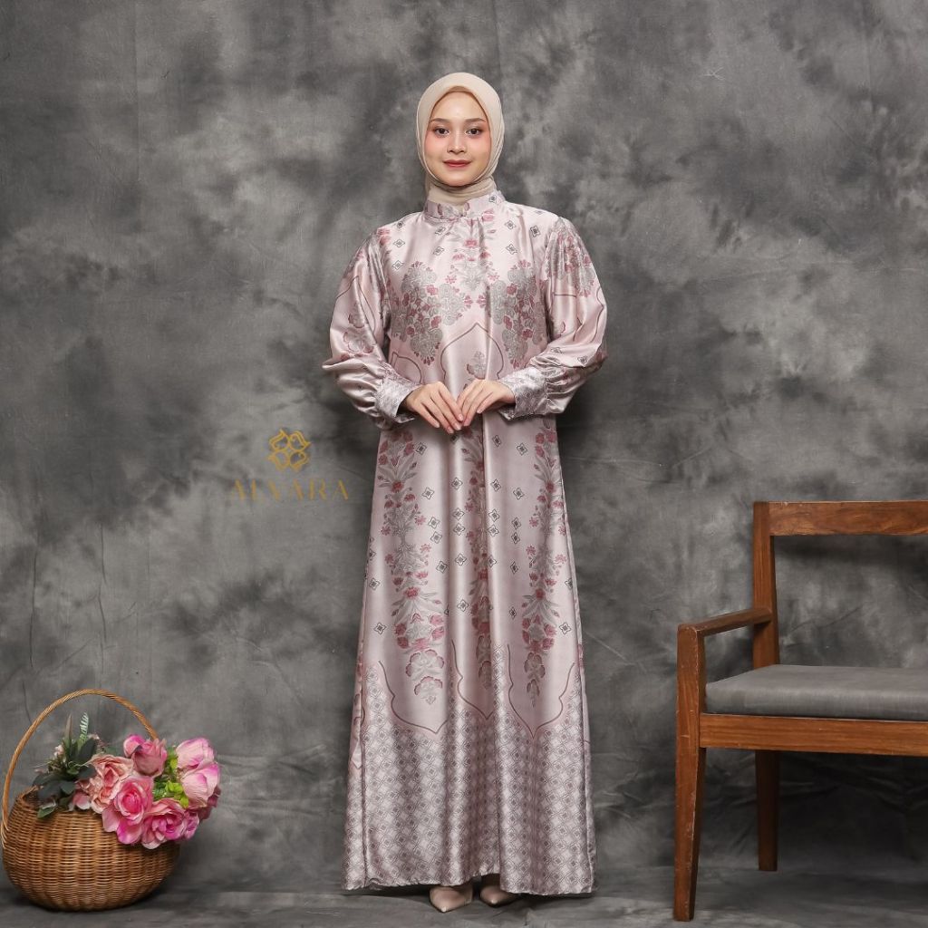 Alvara Gamis Lebaran 2026 Model Terbaru Dress Wanita Nadira Silk Motif Mewah Elegan Big Size Jumbo