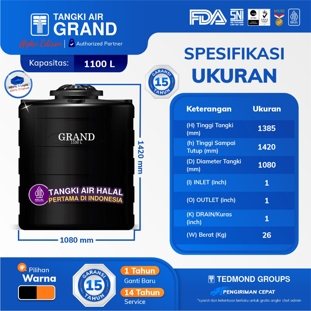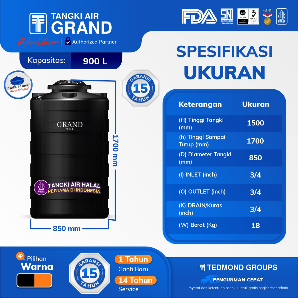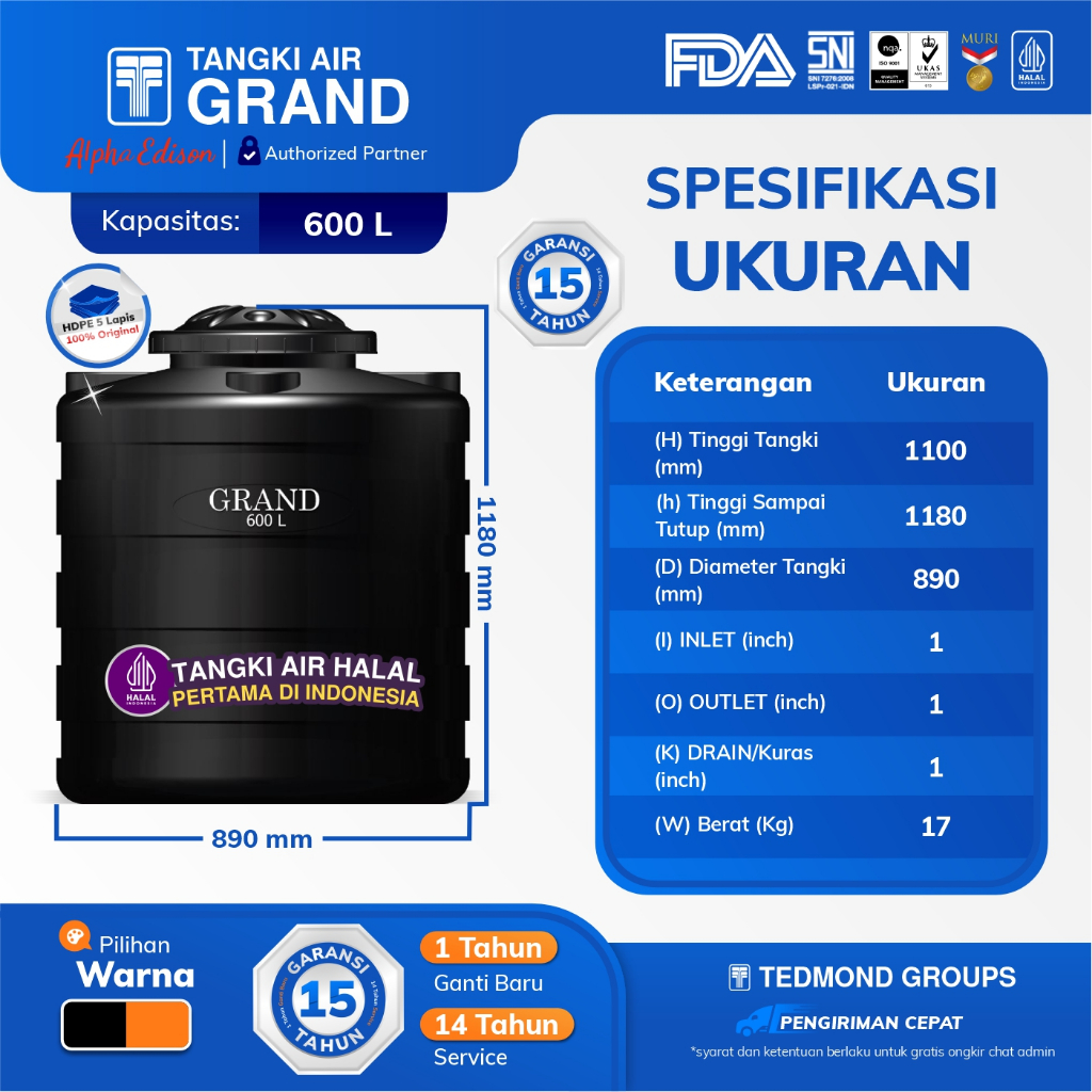 (KHUSUS CARGO) GRAND Blow Tandon Air TEDMOND Tangki Air Toren 300, 600, 700, 900, 1100 Liter | HDPE