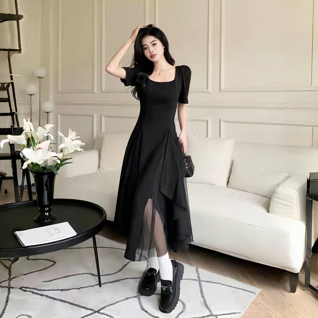 Black Dress Wanita/ Long Dress Hitam Pesta Wanita Premium/ Simple Dress Elegante Gaya Hepburn Prancis