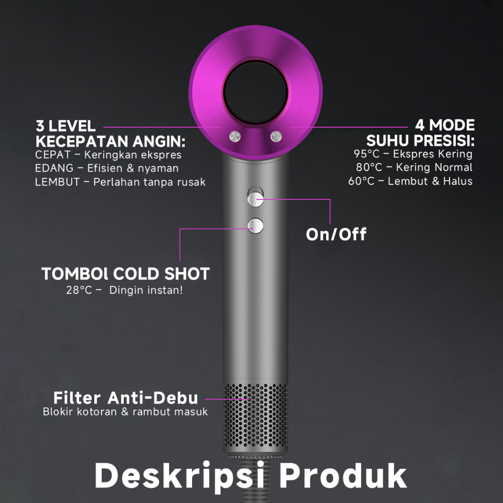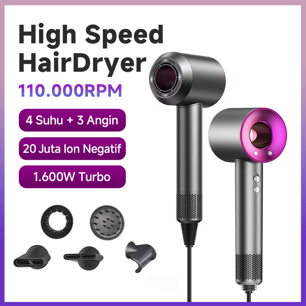 Hair Dryer Super Cepat Turbo / Pengering Rambut - 20J Ion Negatif / 110K Rpm 5Nozel , 3Mode Panas,Perlindungan Rambut (U