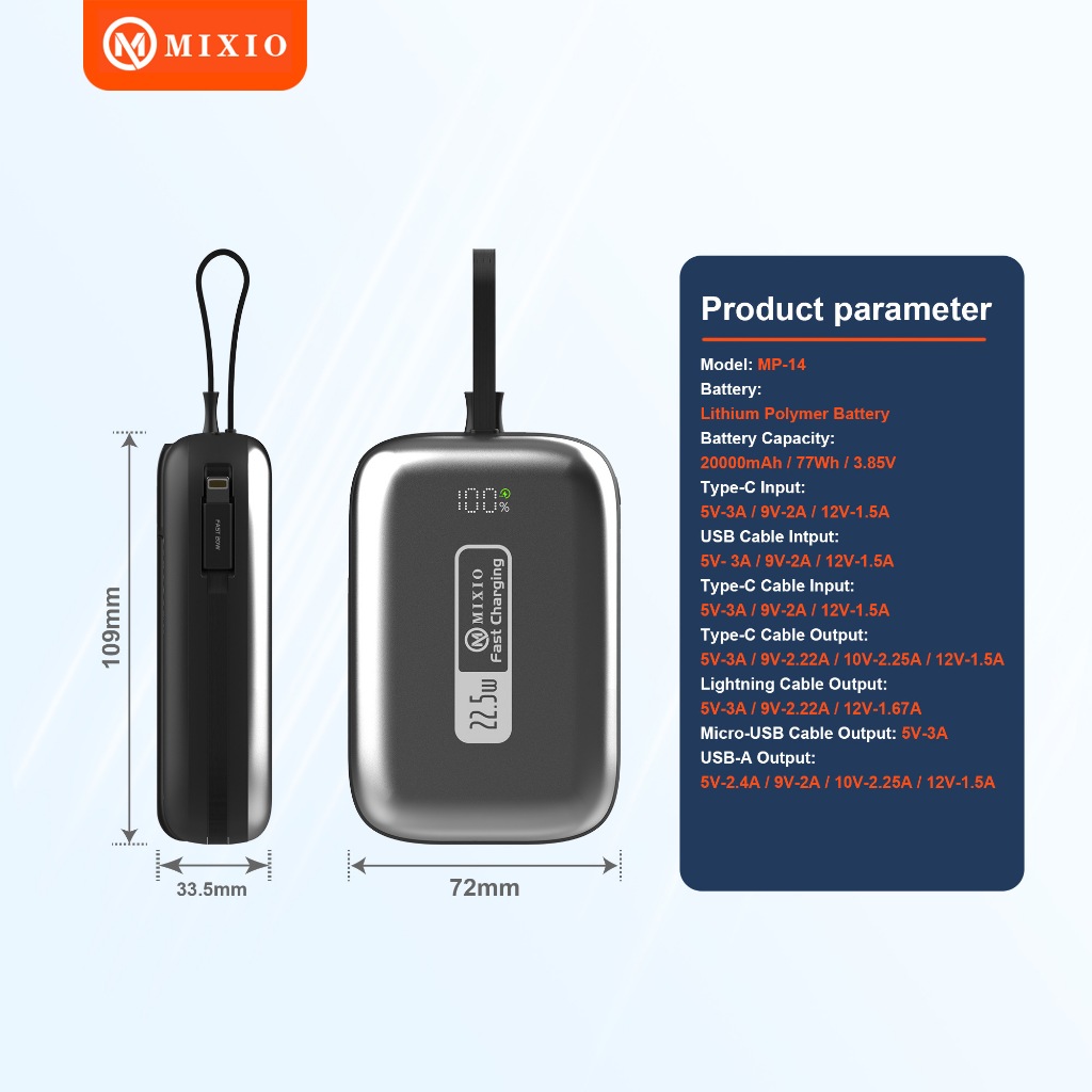 Mixio Mp-14 20000Mah Small Size Powerbank 22.5W With Kabel Fast Charging Lightning & Type C & Micro Usb For Iphone/Andro