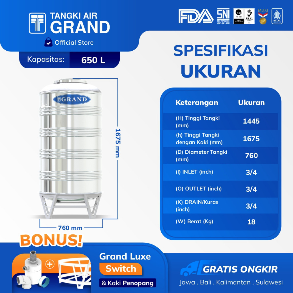 Toren Tandon Air Tangki Stainless Grand TSV 1000 Anti Lumut Garansi 12 Tahun Free Ongkir