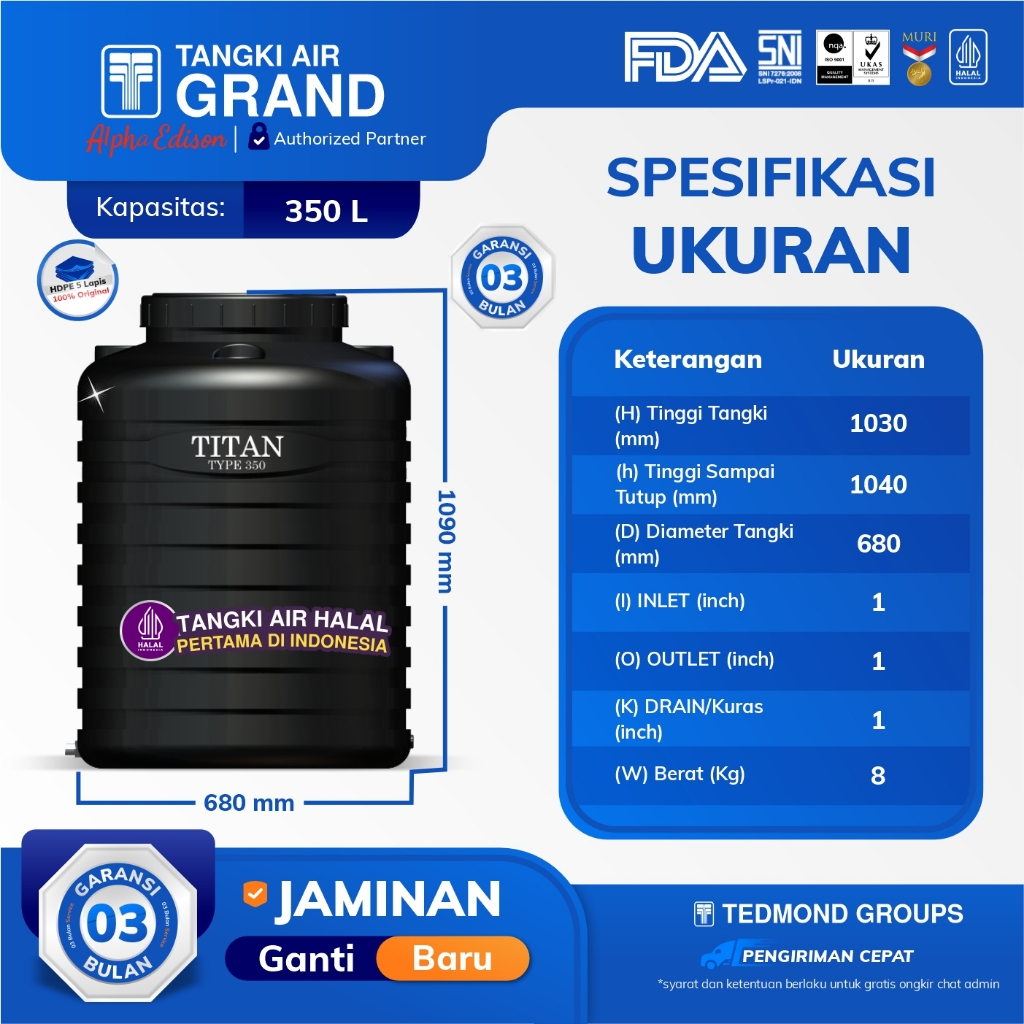 (KHUSUS CARGO) TITAN Tandon Tangki Air Toren 350 liter, 550 Liter, 1000 Liter HDPE