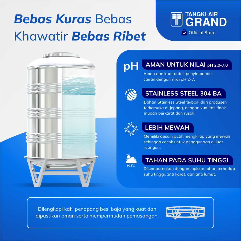 Toren Tandon Air Tangki Stainless Grand TSV 1500 Anti Lumut & Sertifikasi Halal Garansi 12th