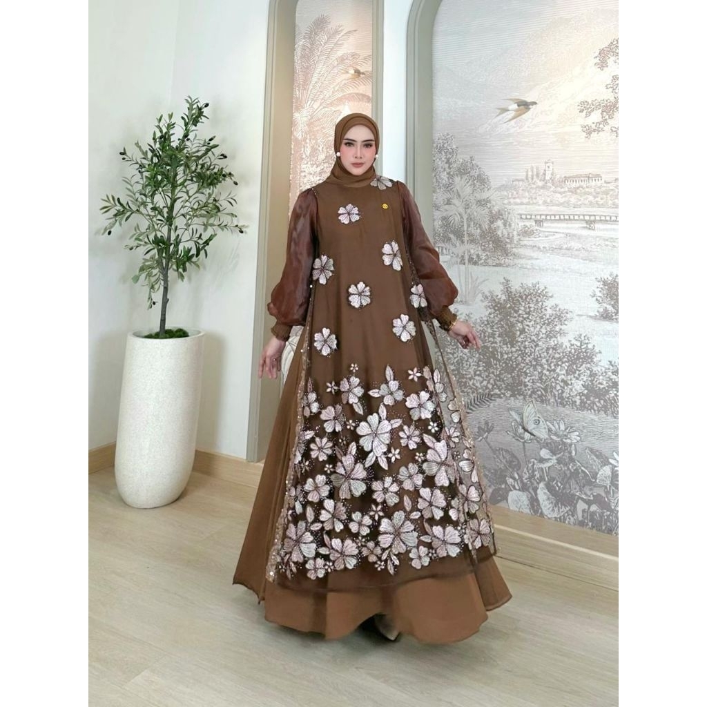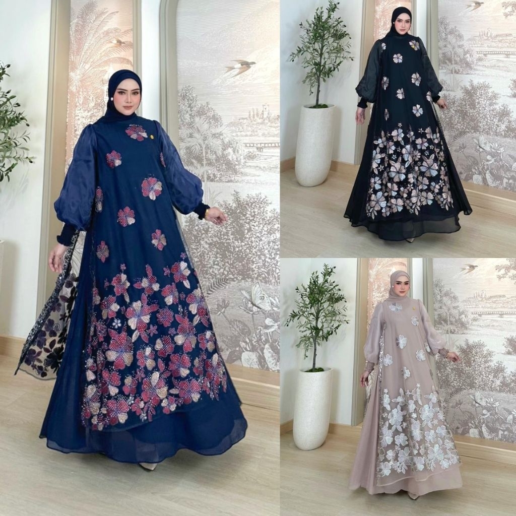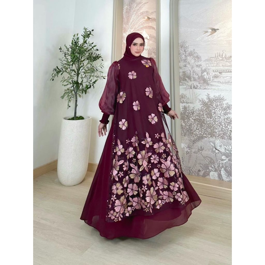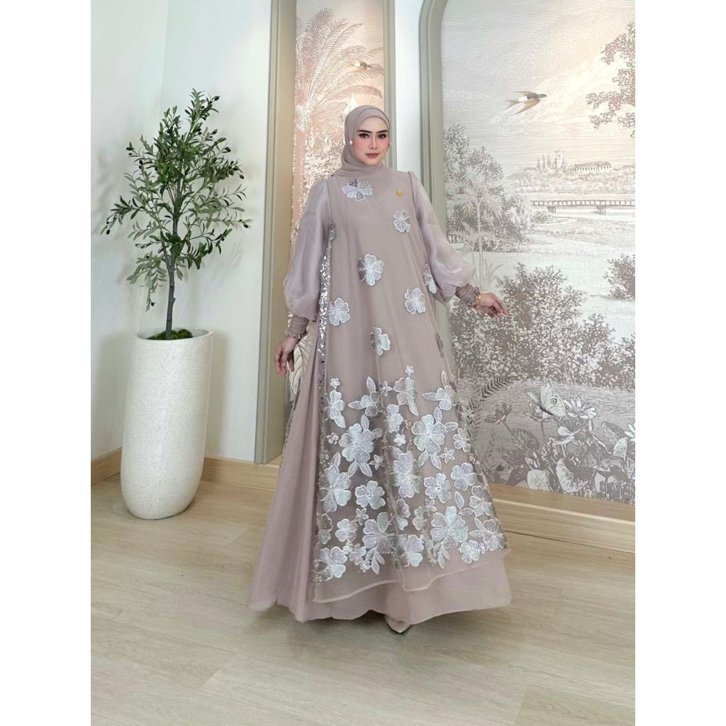 Junnasco Gamis Exclusive Ninona Dress Muslim Bahan Ceruty Babydoll Mix Tulle Garden Bordir 3D Premium Lengan Organza Mew
