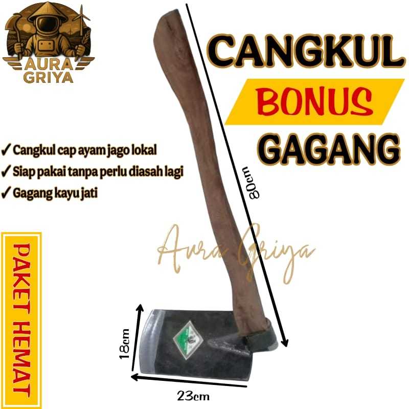 1 Set Sepaket Cangkul Cap Ayam Jago Lokal dan Gagang Kayu - Cangkul Pacul Anti Lengket - Doran Cangkul Alat Pertanian Cangkul Proyek