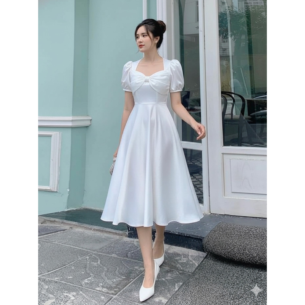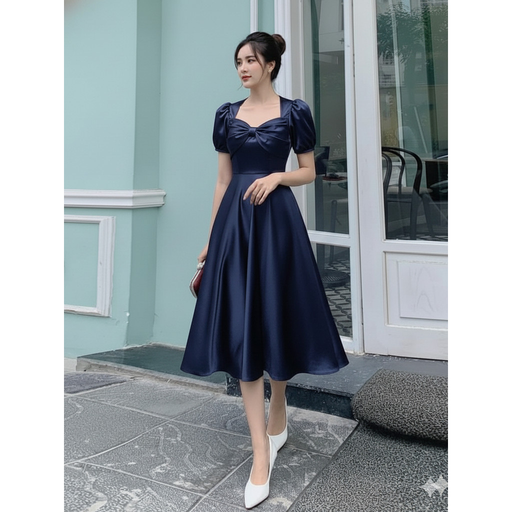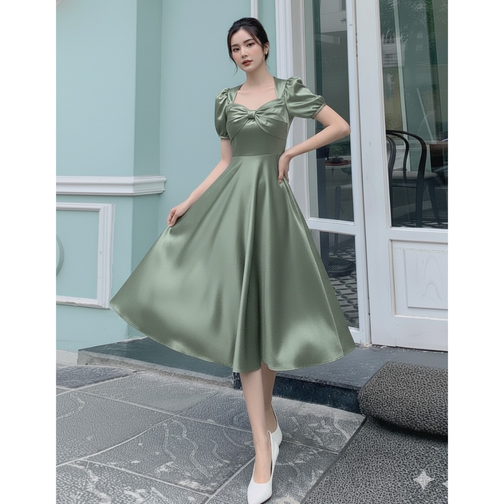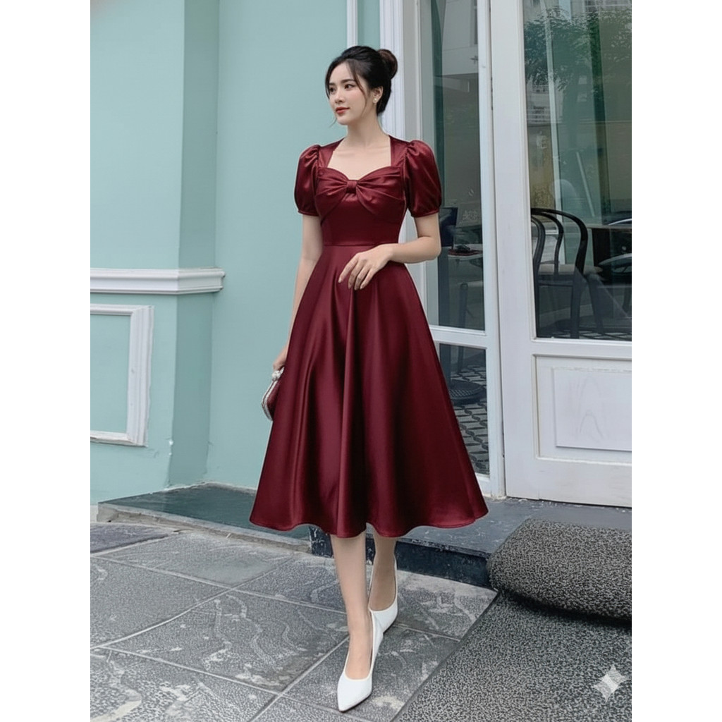 TS097 Midi Dress Satin Velvet | Dress Natal Kekinian | Gaun Pesta Mewah | Dress Kasual Wanita | OOTD