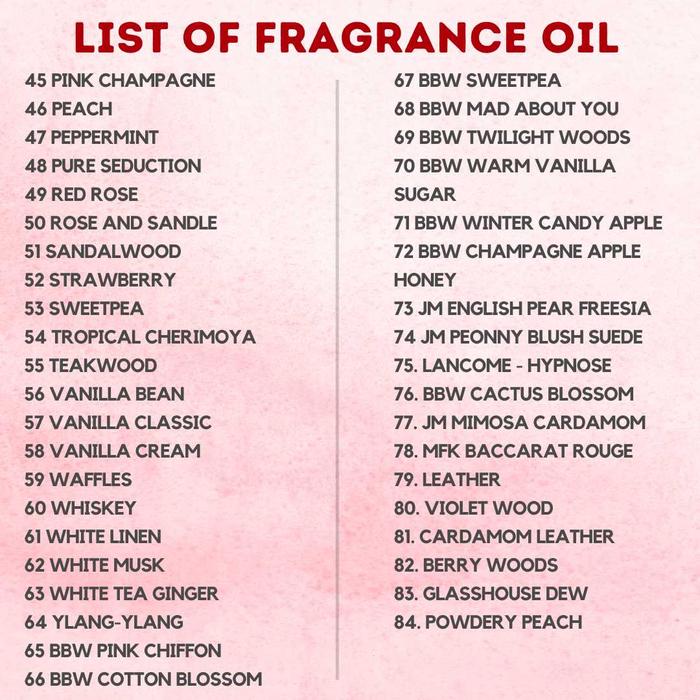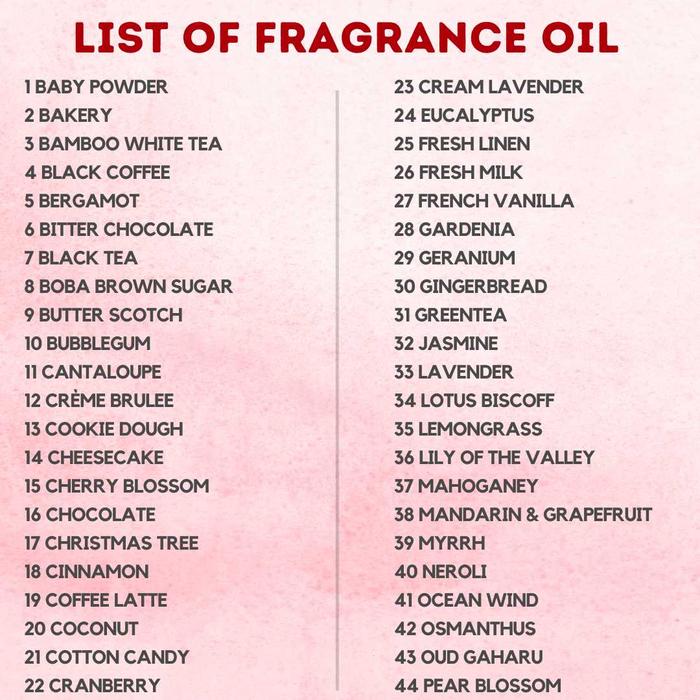 French Vanilla, Bakery, Red Rose, Lily The Valley, lavender, Sandalwood, Osmanthus, Peppermint, Chocolate, Coffee Latte