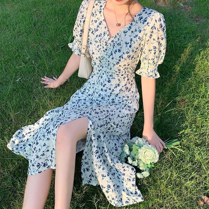 ZLORE - #DF01 Floral Midi Dress Import / Broken White Flower Slit Dress (S-XXL)