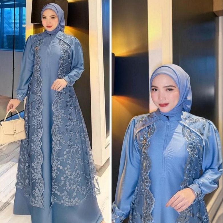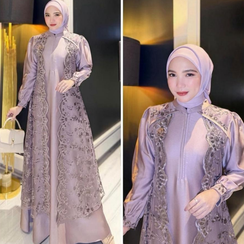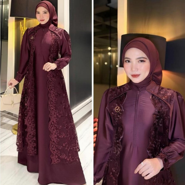 Marbella Dress Matt Satin Velvet Mix Brukat Bordir Gamis Pesta Kondangan Mewah Elegant Mahogany