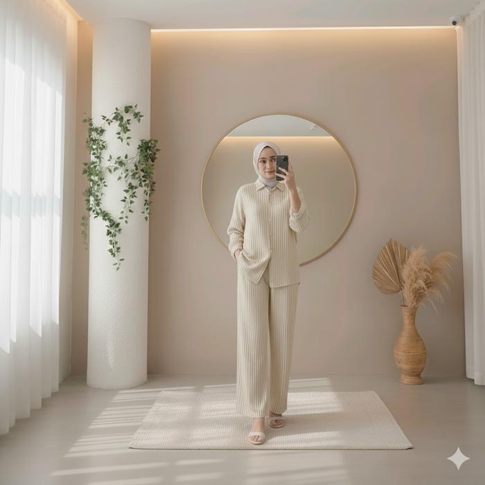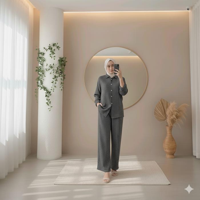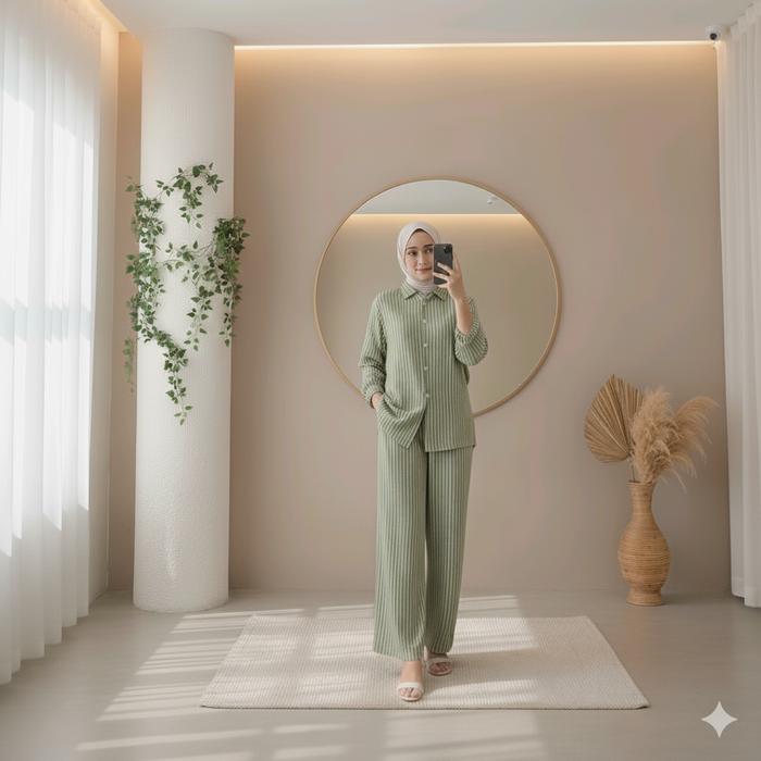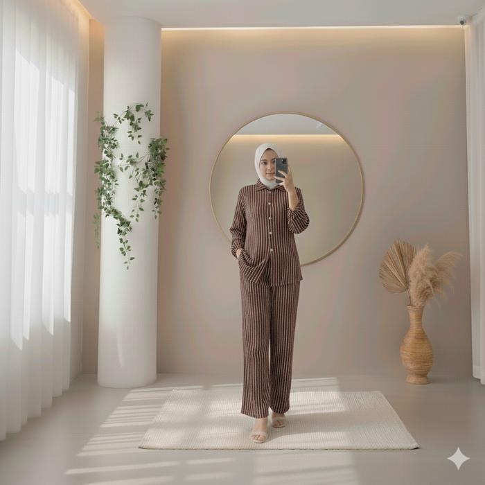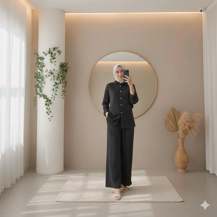 PRODUK LOKAL - MONICA ONE SET STRIPE | SETELAN ATASAN BAJU TUNIK WANITA MUSLIM REMAJA DEWASA CELANA KULOT MOTIF SALUR BAHAN KATUN - SKYBLUE