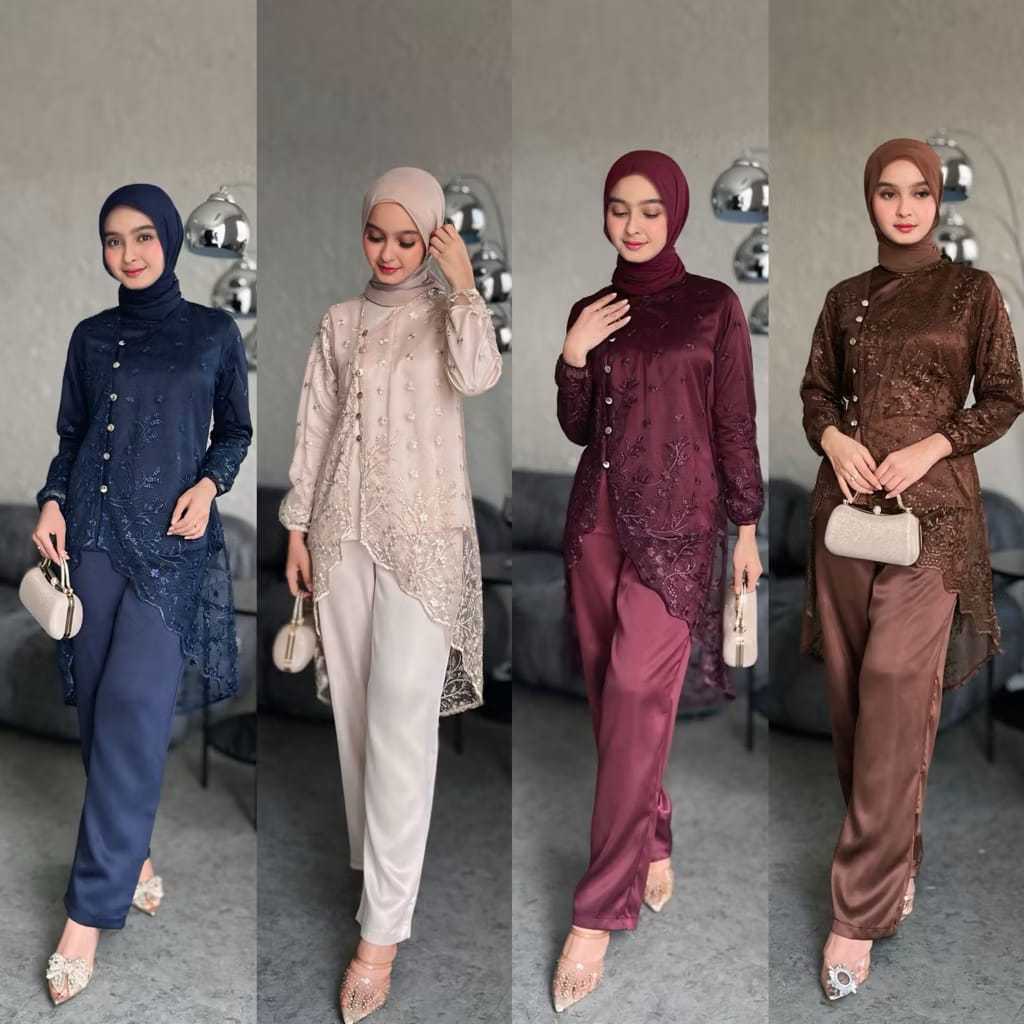 Karmila Oneset Terbaru Atasan Celana Outer bahan velvet mix brukat premium stelan baju pesta 2026